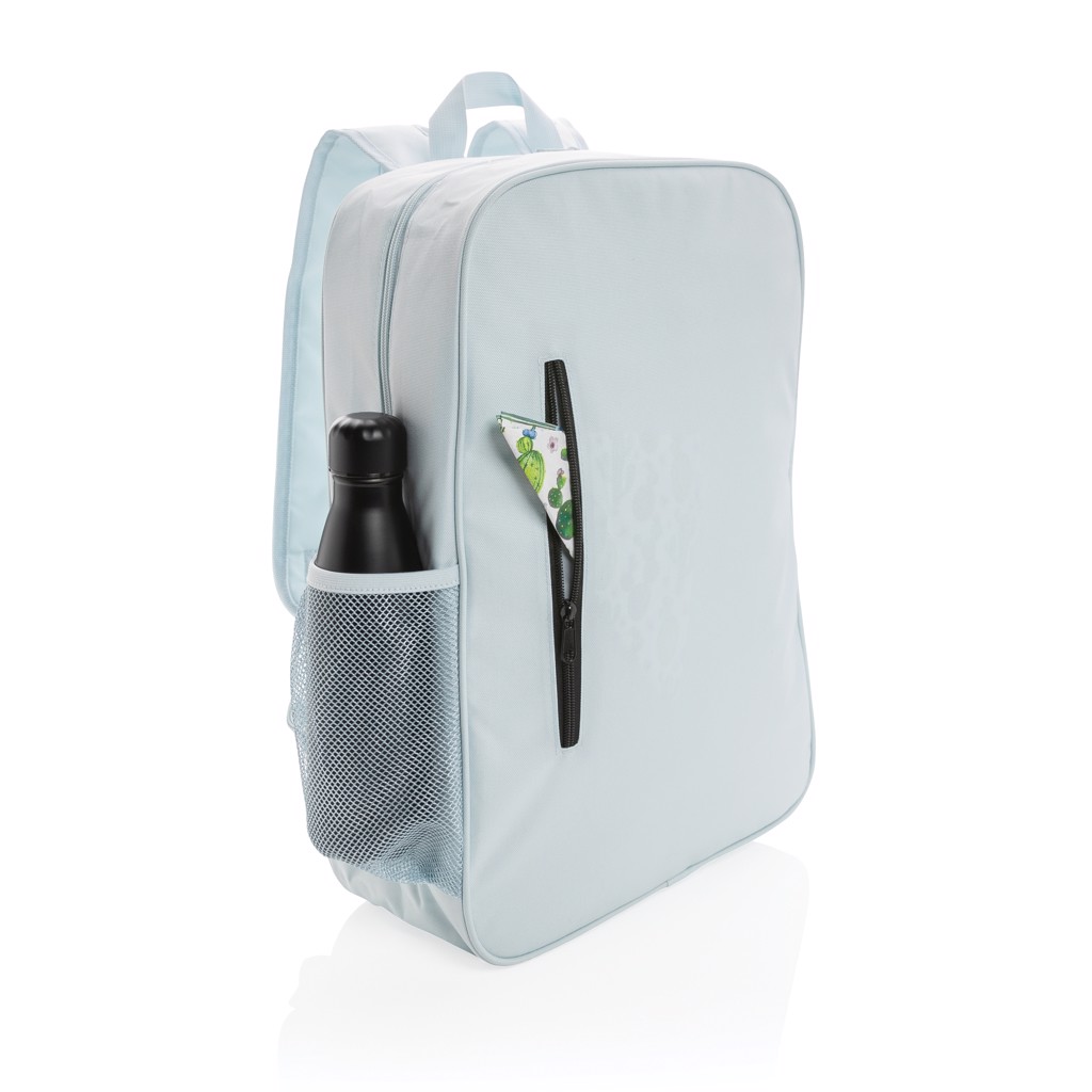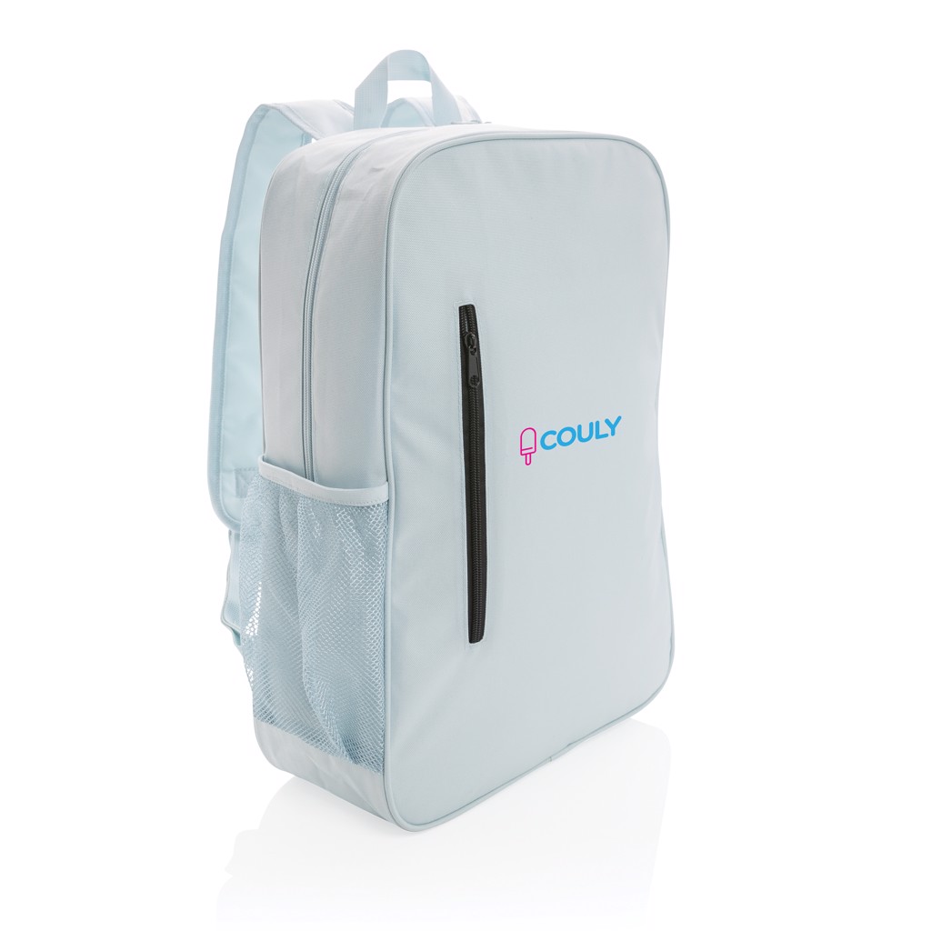 Keep your hands free and your stuff cold. The Tierra backpack is designed with maximum portability in mind. Great for hiking and picnics. The backpack holds 12 cans or 8 cans and 2 wine bottles. A zippered front pockets holds your keys and other accessories. Exterior 100% 600D polyester, interior 210D polyester and PEVA. PVC free.
