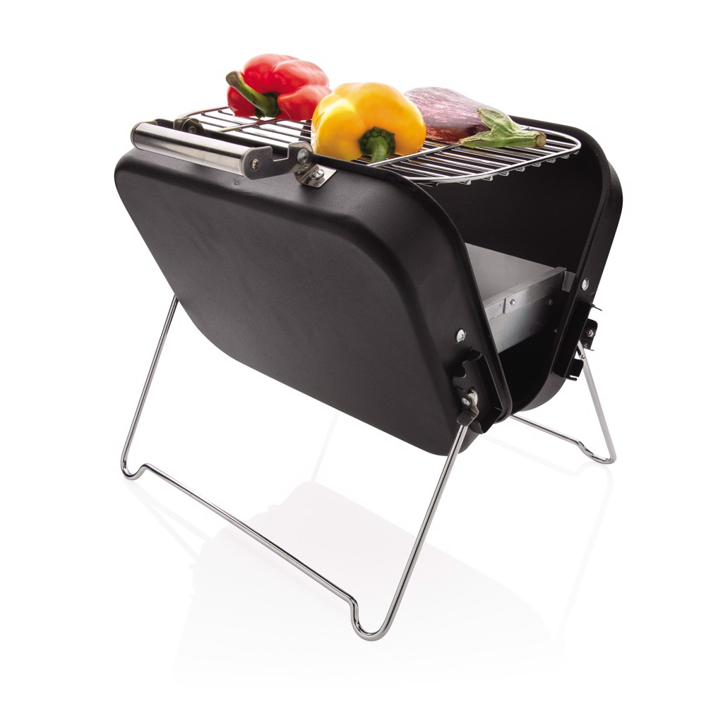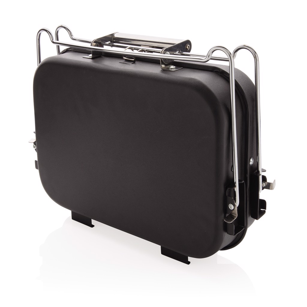 Portable and versatile suitcase-style barbecue with removable coal tray and carry handle. The barbecue features a lightweight yet durable stainless steel construction with a black powder coated finish and clasp to lock shut. Perfect for those spontaneous picnics in the outdoors.