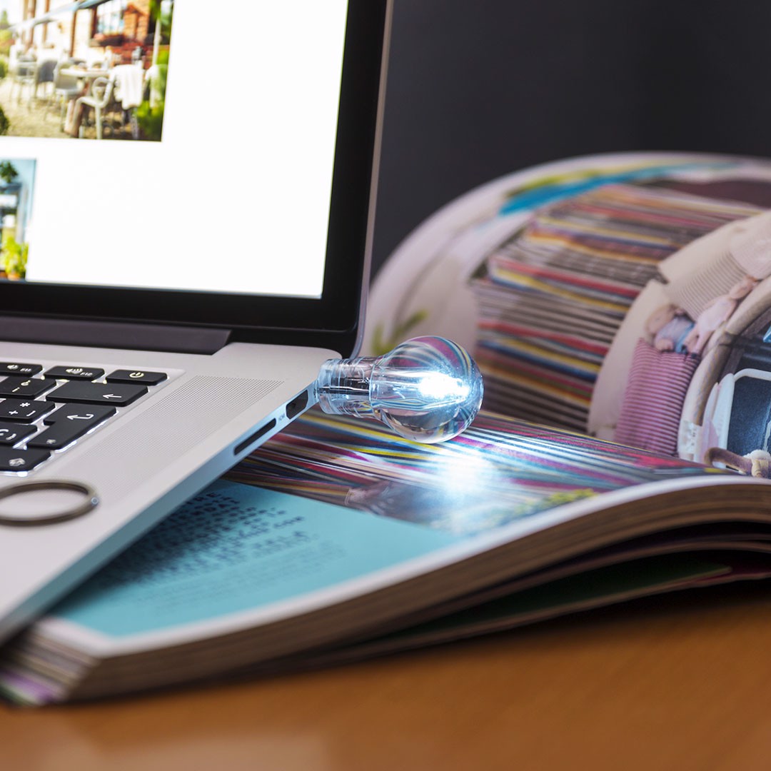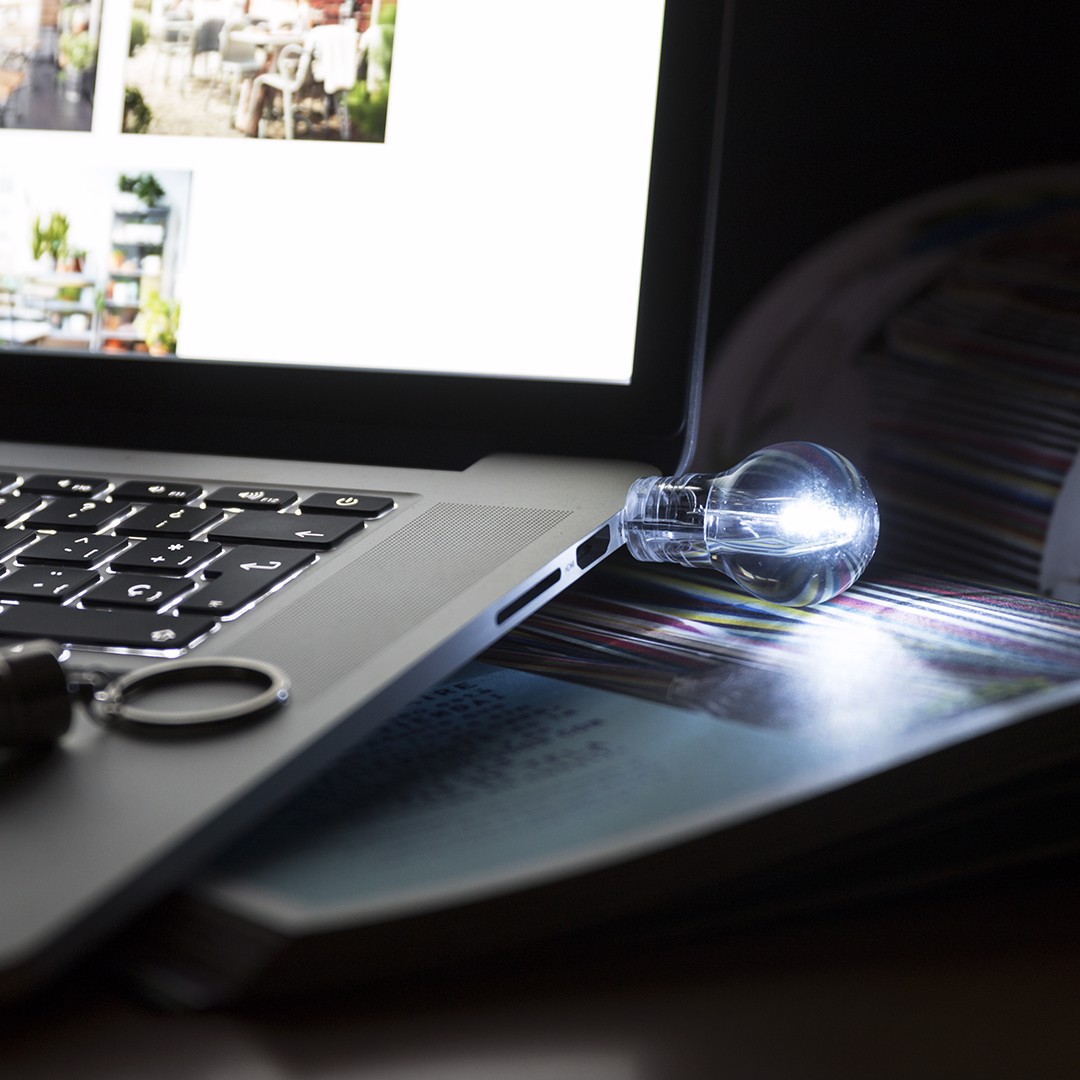 16GB USB flash drive with original bulb design that lights up with white light when connected to the USB port. With keychain and presented in an individual case. Led Lights. Individual Presentation