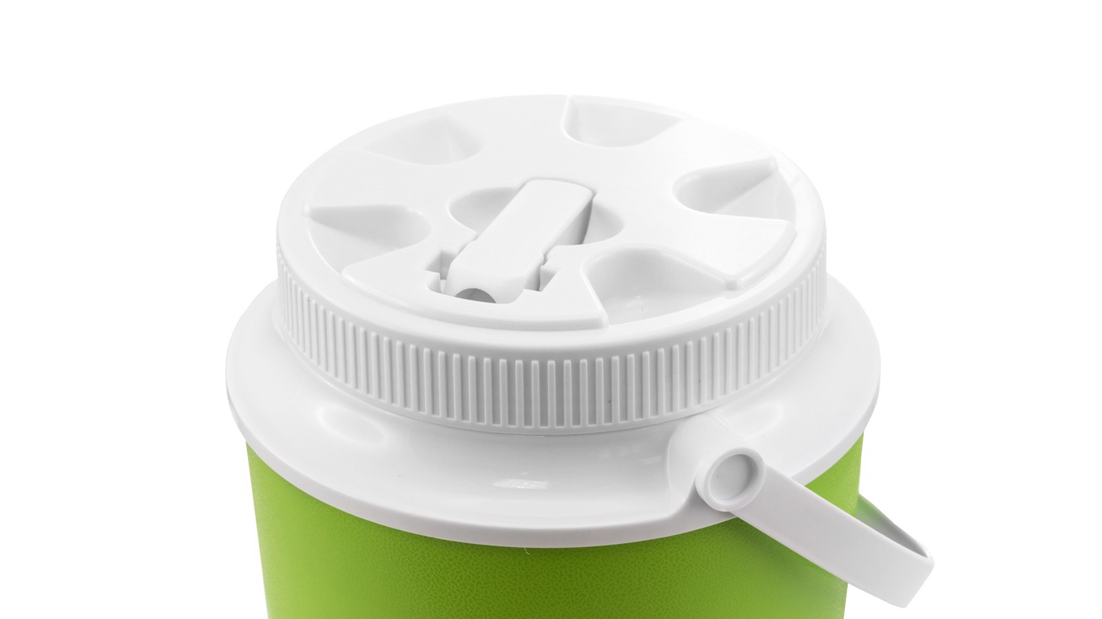 2 liters thermos flask in an original bicolor design, with soft and resistant body in bright tones. Screw-on cap with dosing device and resistant handle in white color. 2 l