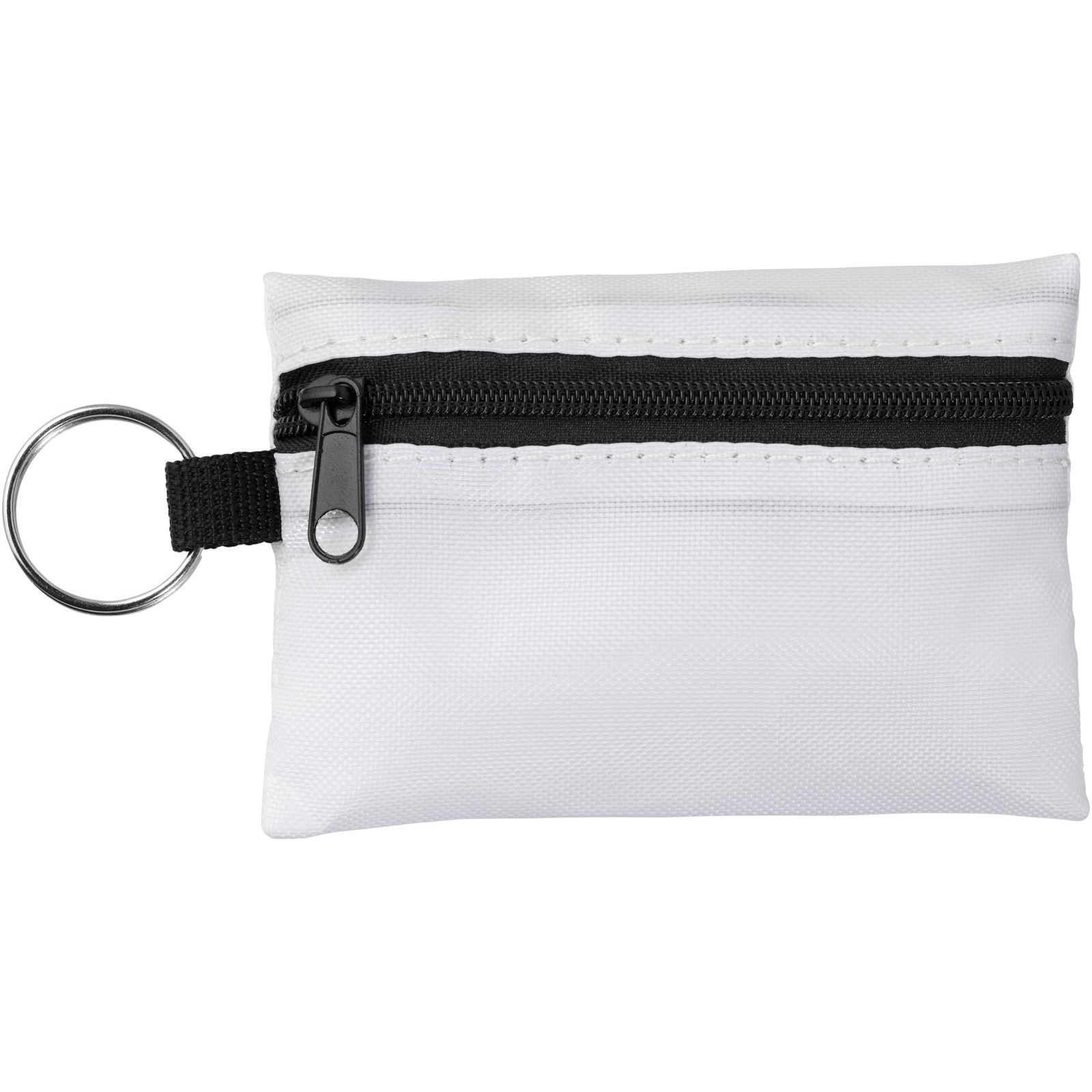 Convenient polyester pouch with keyring that holds 16 pieces of first aid supplies. The kit contains a pair of scissors (9 cm), 2 skin cleansing swabs, 1 elastic bandage (4 metre x 6 cm), 2 cotton balls (0.5g), 3 safety pins (3.6 cm), 5 plasters (45x19 mm), and 2 cotton pins (8 cm). Great for travelling, festival, events, and other outdoor activities, and has a large decoration area. A first aid kit is regarded as a medical device and is governed by 93/42/EEC, based on the intended use: “diagnosis, prevention, monitoring, treatment or alleviation of disease”. This medical device belong to CLASS I, Is.