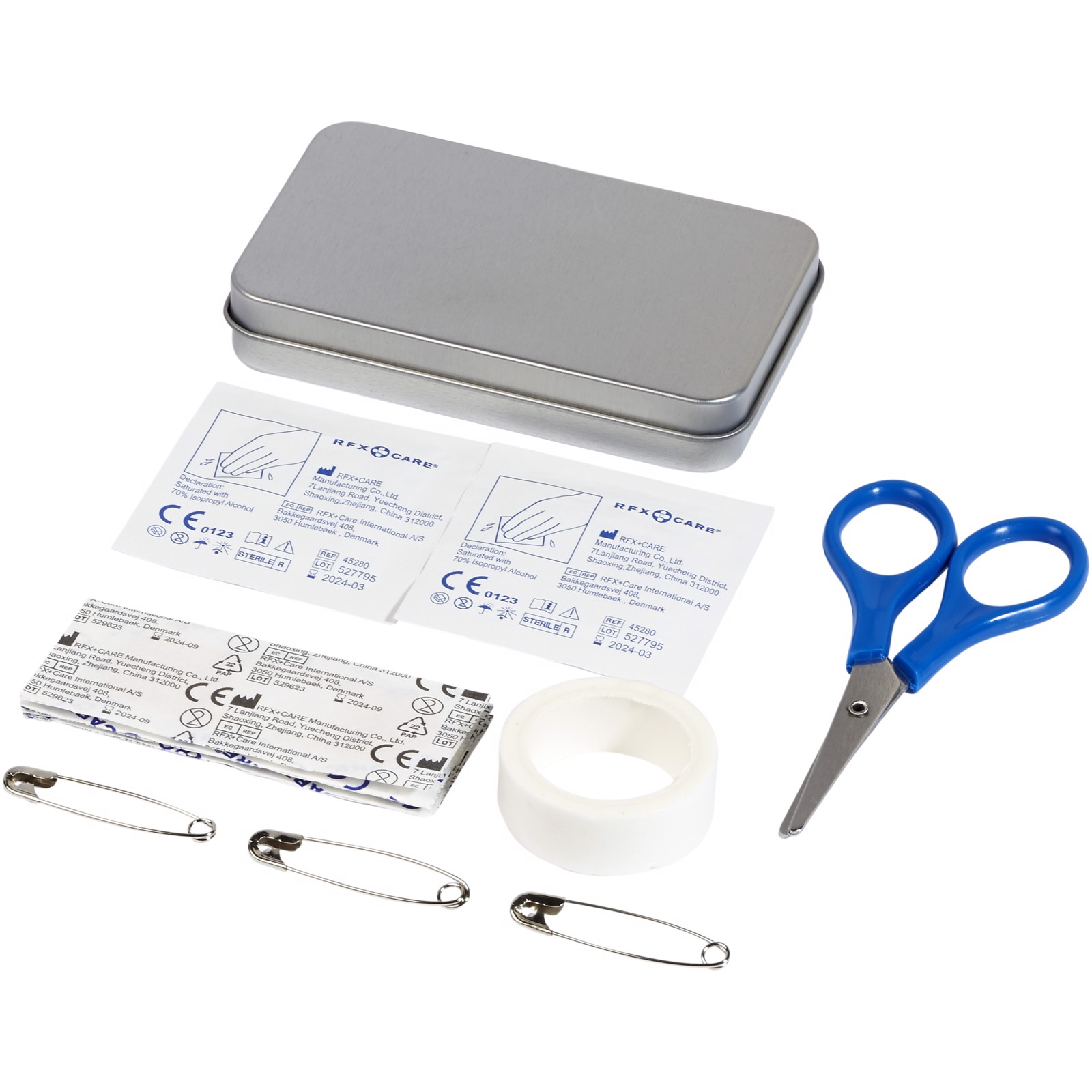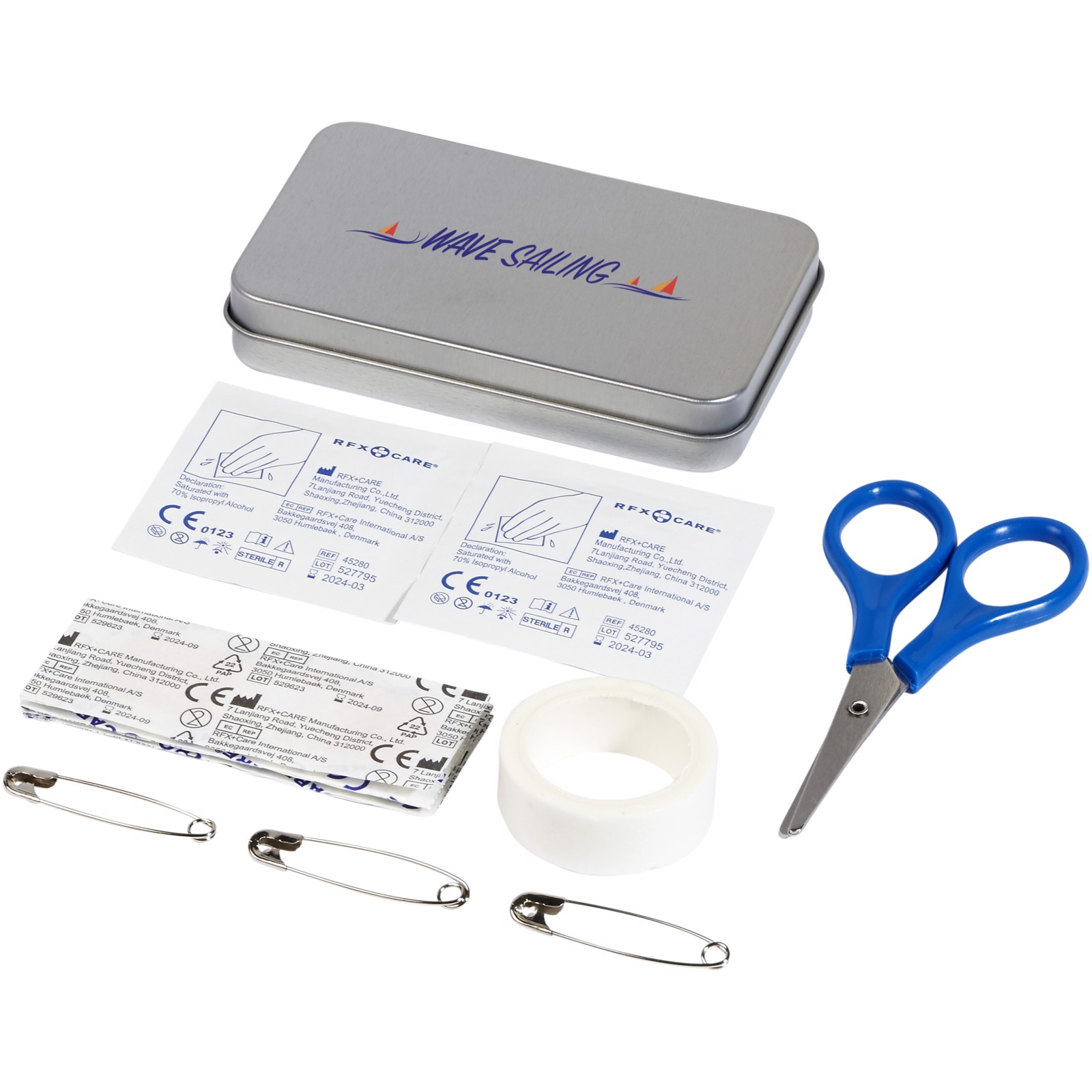 A convenient folding lid tin box which holds 12 pieces of first aid supplies. Great for at home, in the car, or at work, and has a large decoration area on top of the lid. A first aid kit is regarded as a medical device and is governed by 93/42/EEC, based on their intended use: “diagnosis, prevention, monitoring, treatment or alleviation of disease”. This medical device belong to CLASS I, Is.