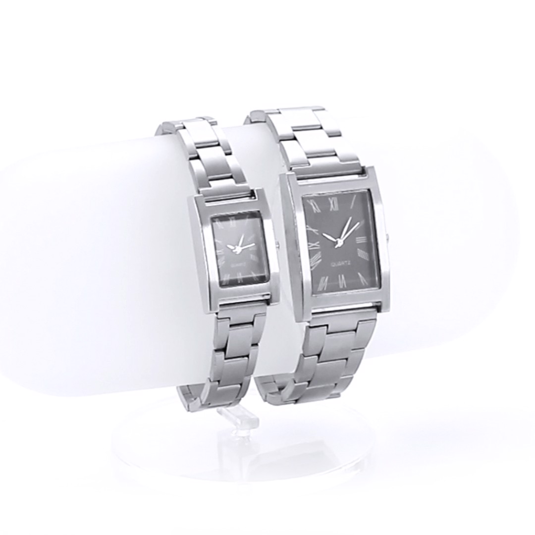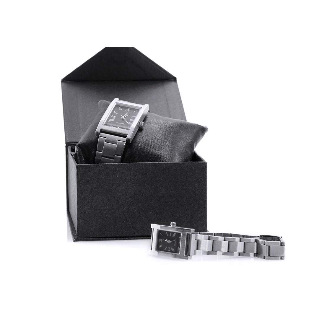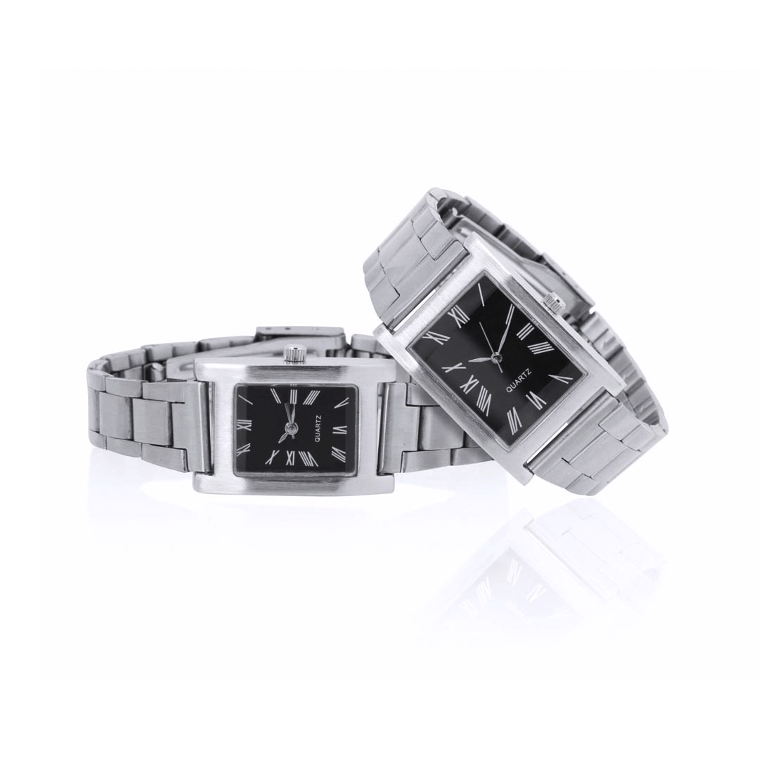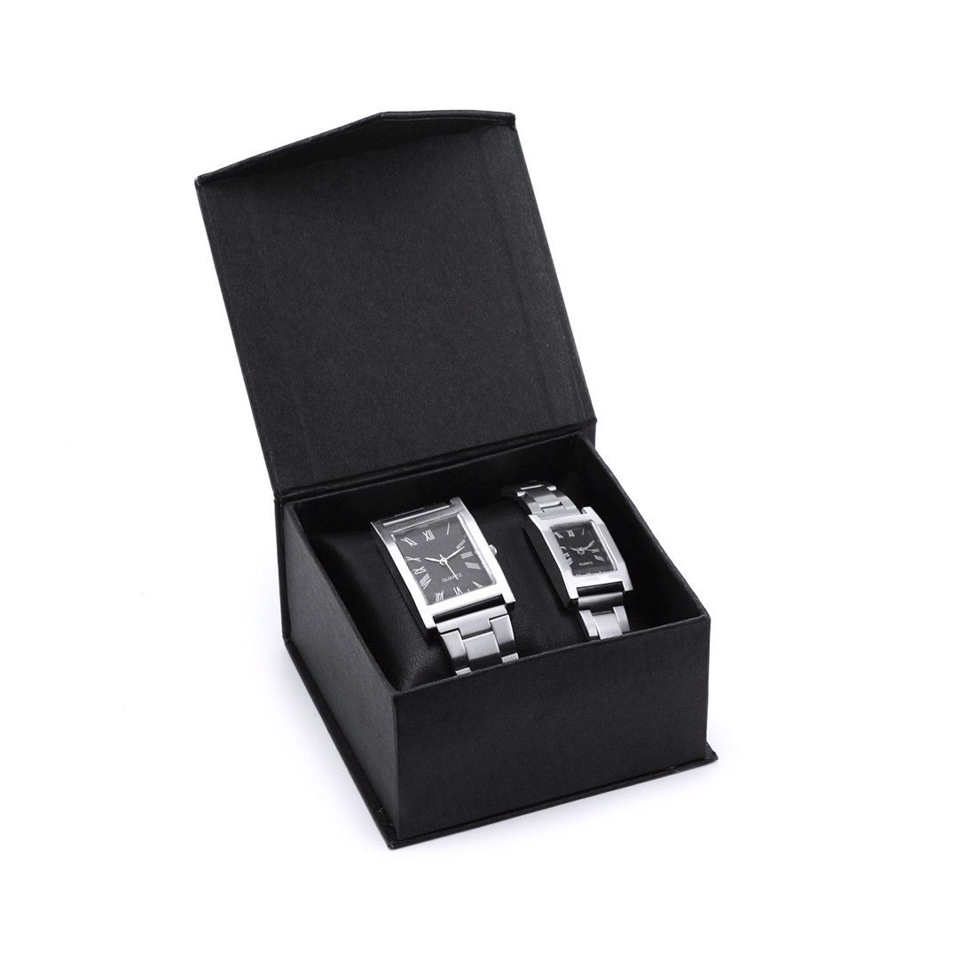 Elegant set of wristwatches for men and women. Metal box with rectangular analogue dial and adjustable metal strap. Presented in a black individual case with magnetic closure and die-cut inside.