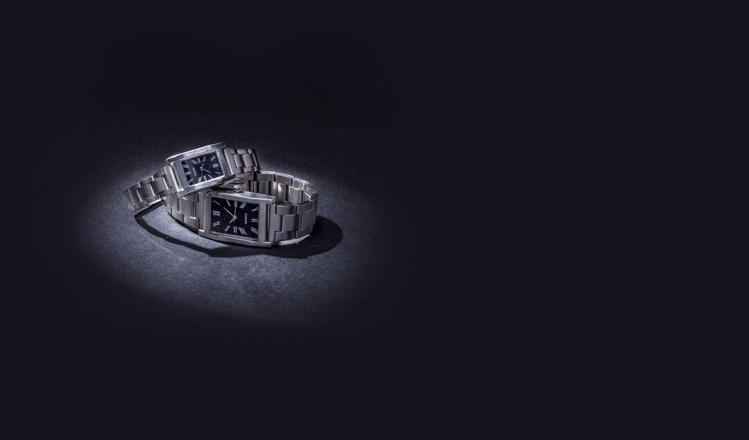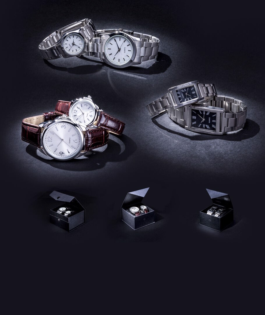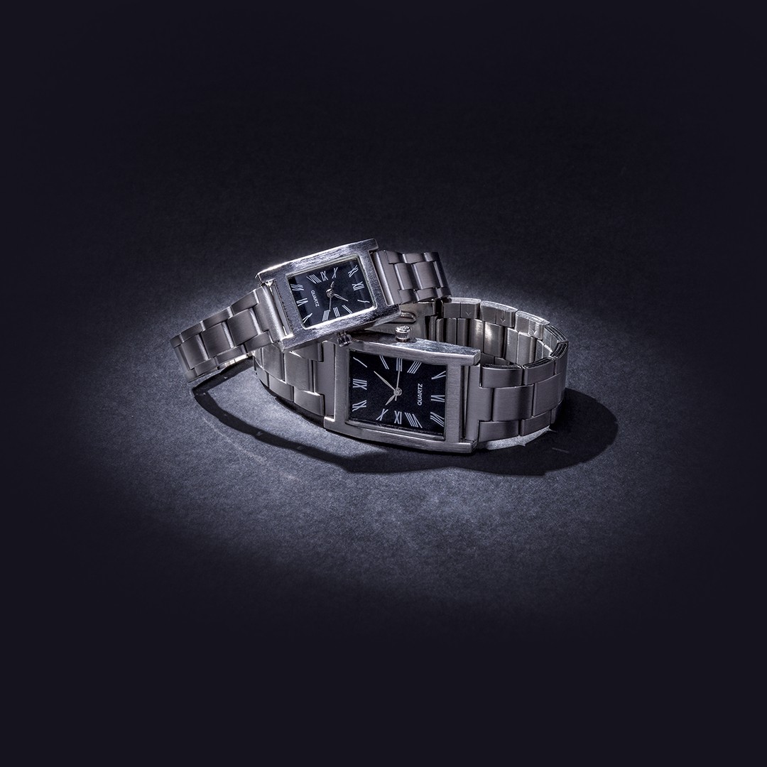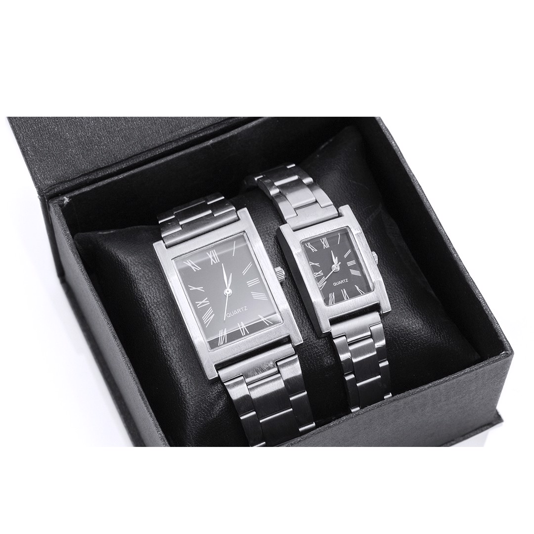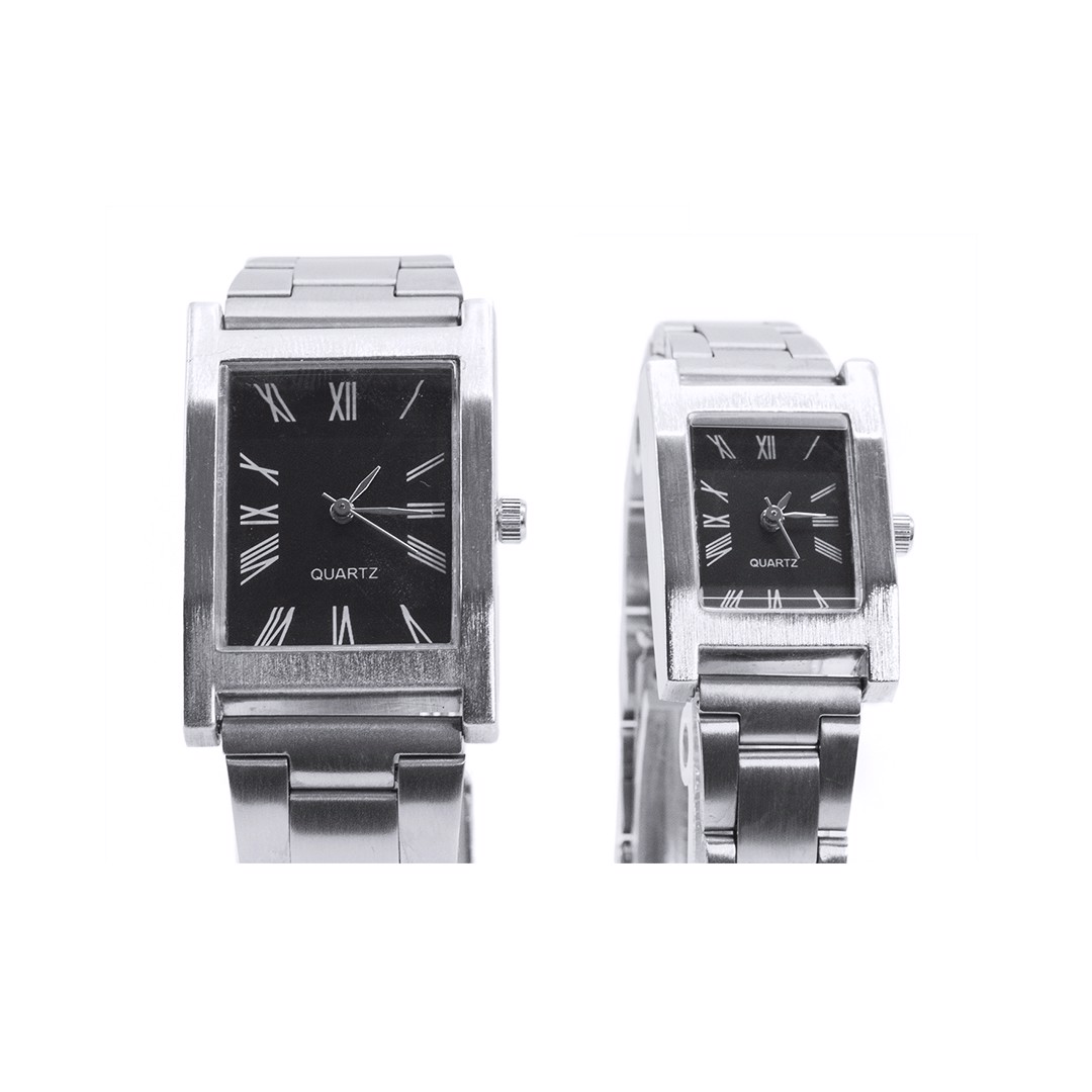 Elegant set of wristwatches for men and women. Metal box with rectangular analogue dial and adjustable metal strap. Presented in a black individual case with magnetic closure and die-cut inside.