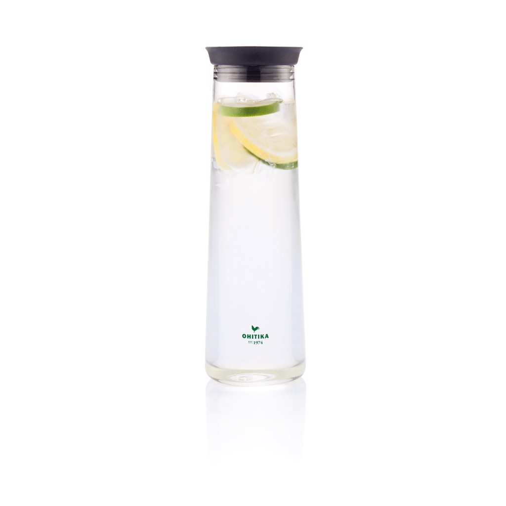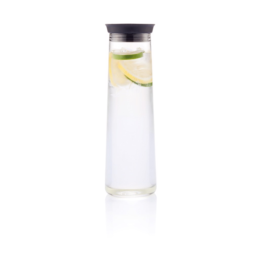 Trendy 1.2 litre glass water carafe with silicone lid.