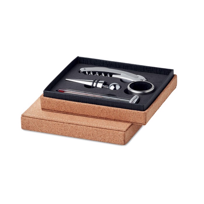 Wine set presented in cork laminated box. Includes wine stopper, corkscrew, bottle collar and thermometer. Cork is a natural material, due to its structural nature and surface porosity the final print result per item may have deviations.