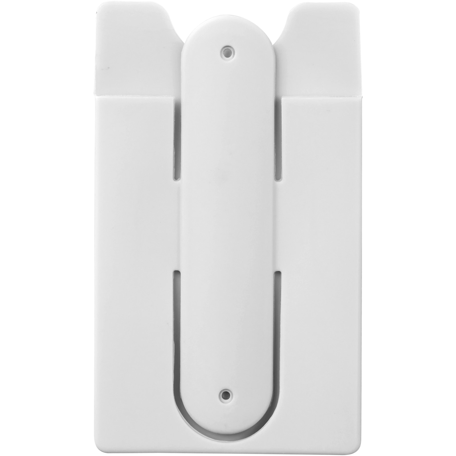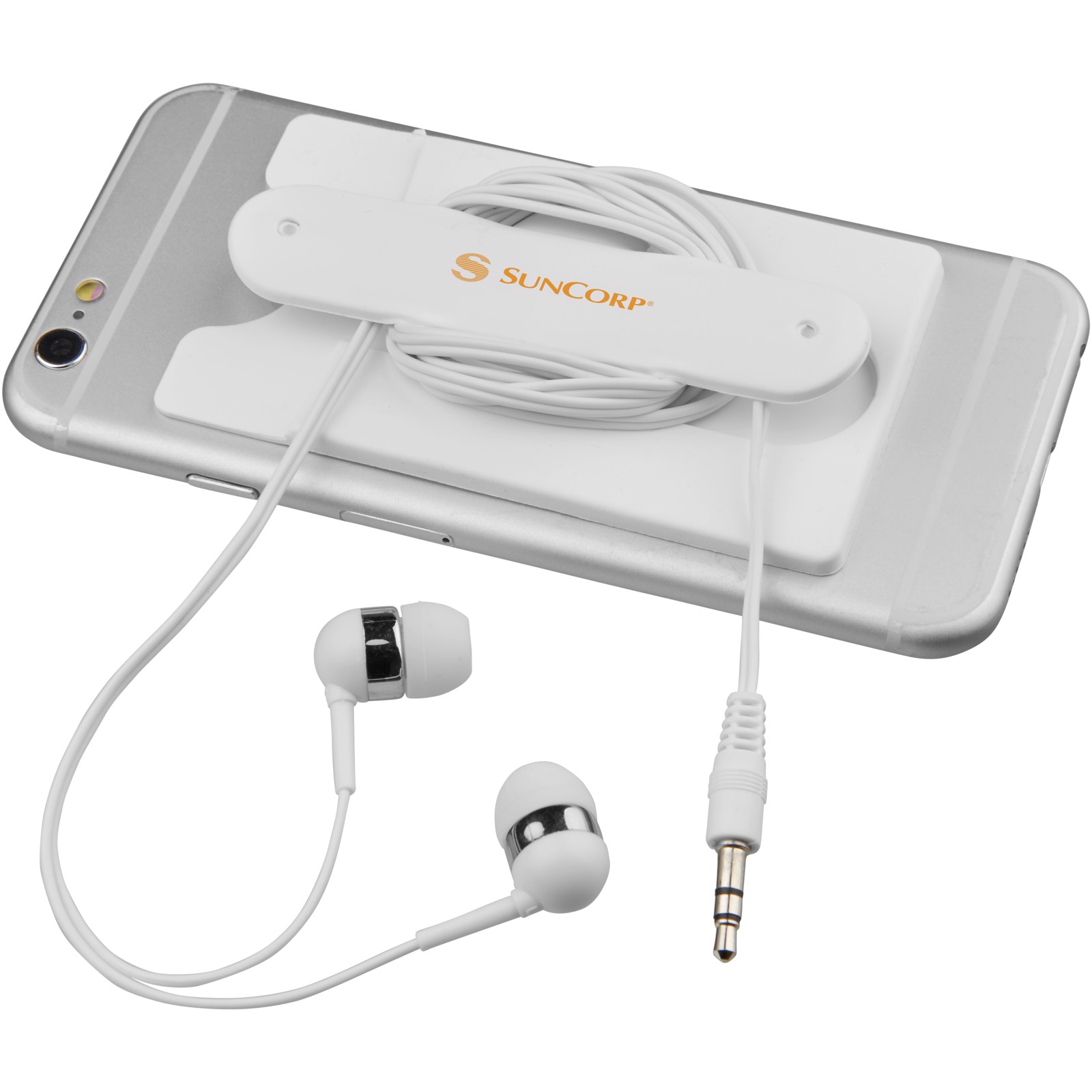A soft protective silicone wallet with adhesive tape that can be easily attached to the back of a phone to hold 2-3 credit cards and/or ID cards. It can also be used as a phone stand or as earbuds wrap. Includes wired earbuds.
