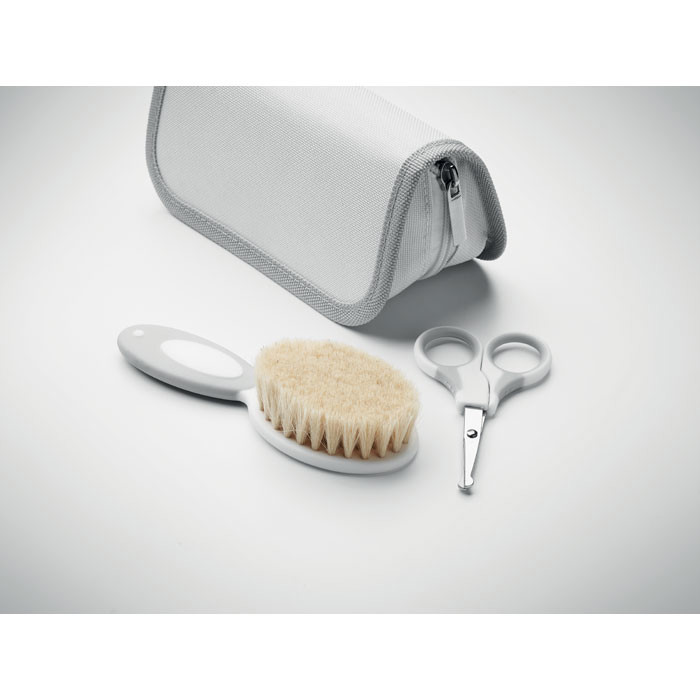 6 piece baby grooming set. Includes: gentle care brush, baby comb, tooth brush, nail file, nail clippers and scissors. Presented in 600D polyester bag.