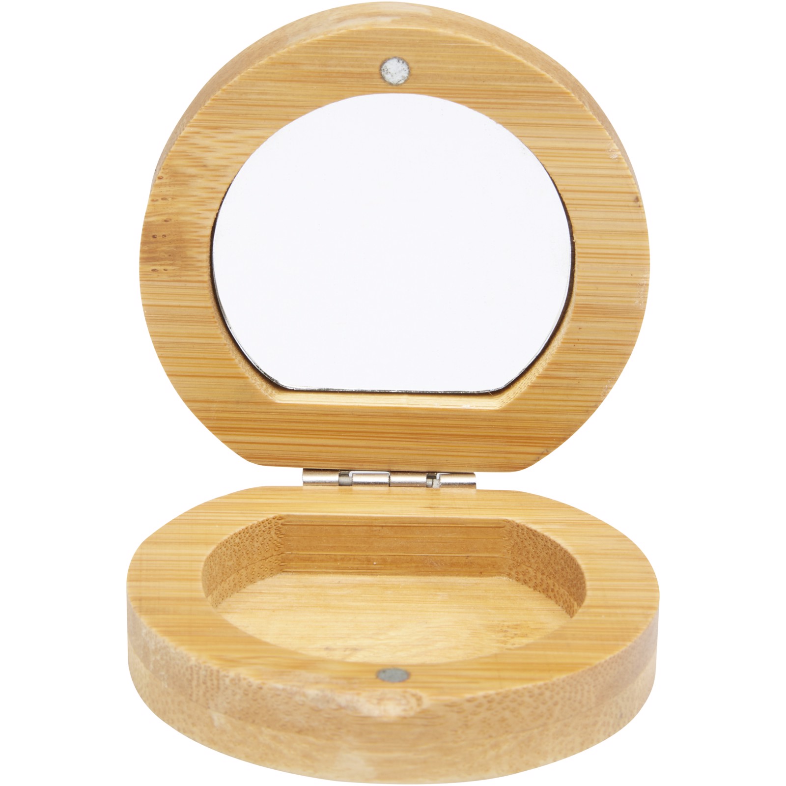 Compact pocket bamboo mirror for travel or daily skincare or makeup use. There is a small compartment at the bottom of the mirror for small accessories. The bamboo used is sourced and produced following sustainable standards.