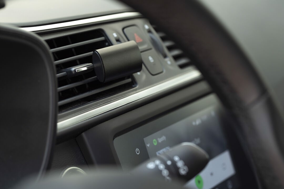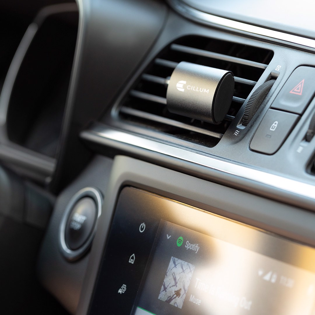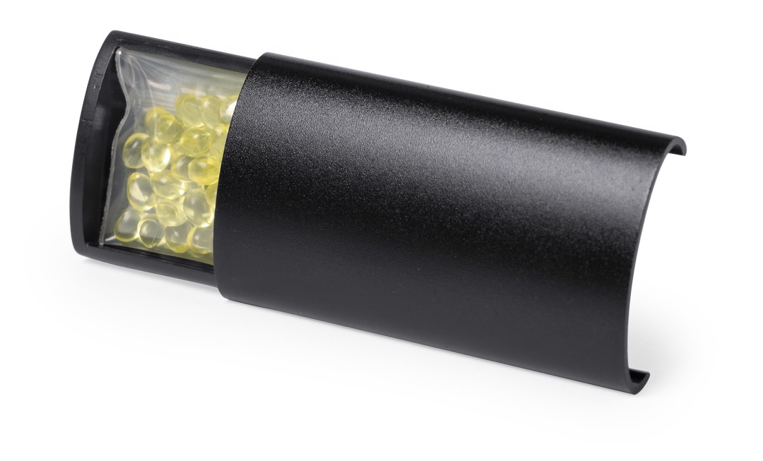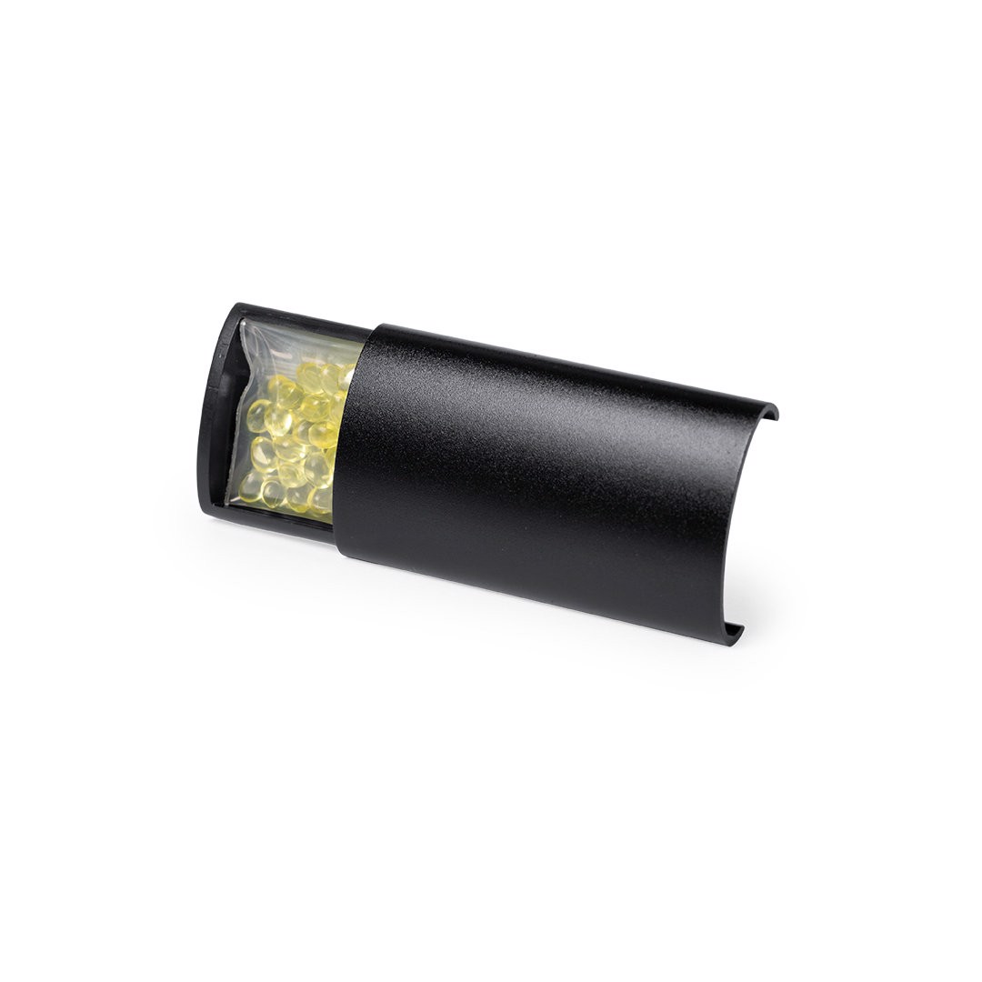 Dashboard air freshener in an elegant design. With slide front in granulated aluminum and a resistant backside holder for grill. Perfume balls lemon scented and available in silver and black color finisings. Lemon Aroma