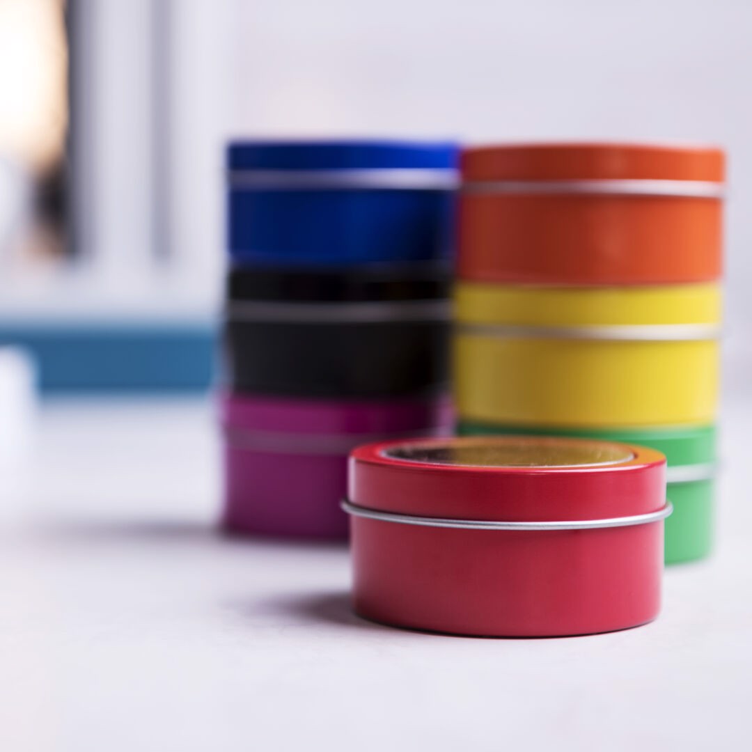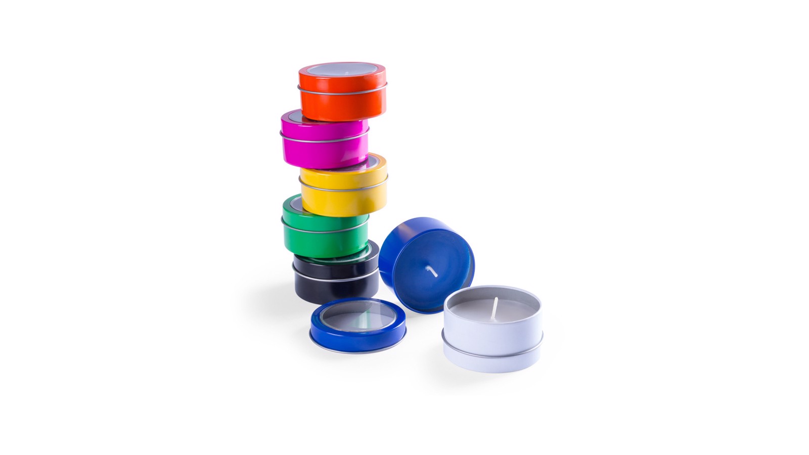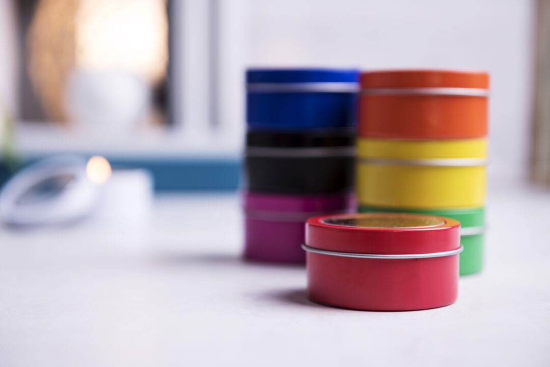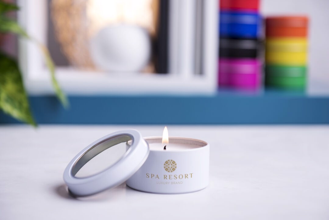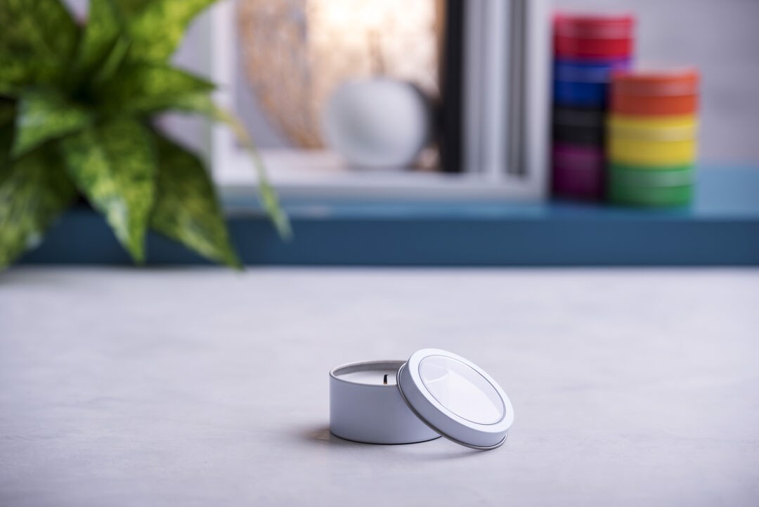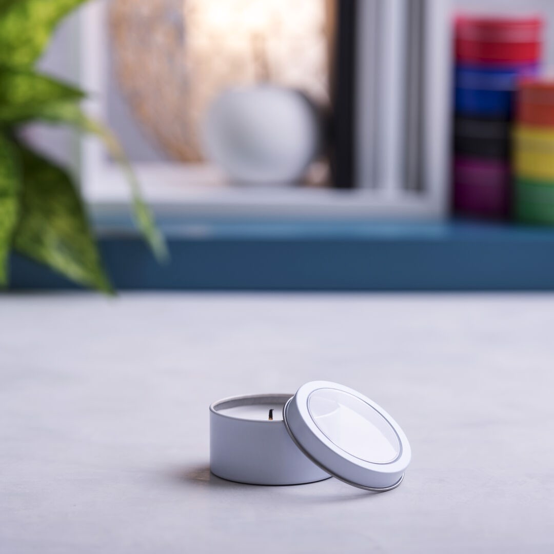 Vanilla fragrance aromatic candle. Presented in an original metallic jar with transparent window in a wide range of bright tones. Vanilla Aroma