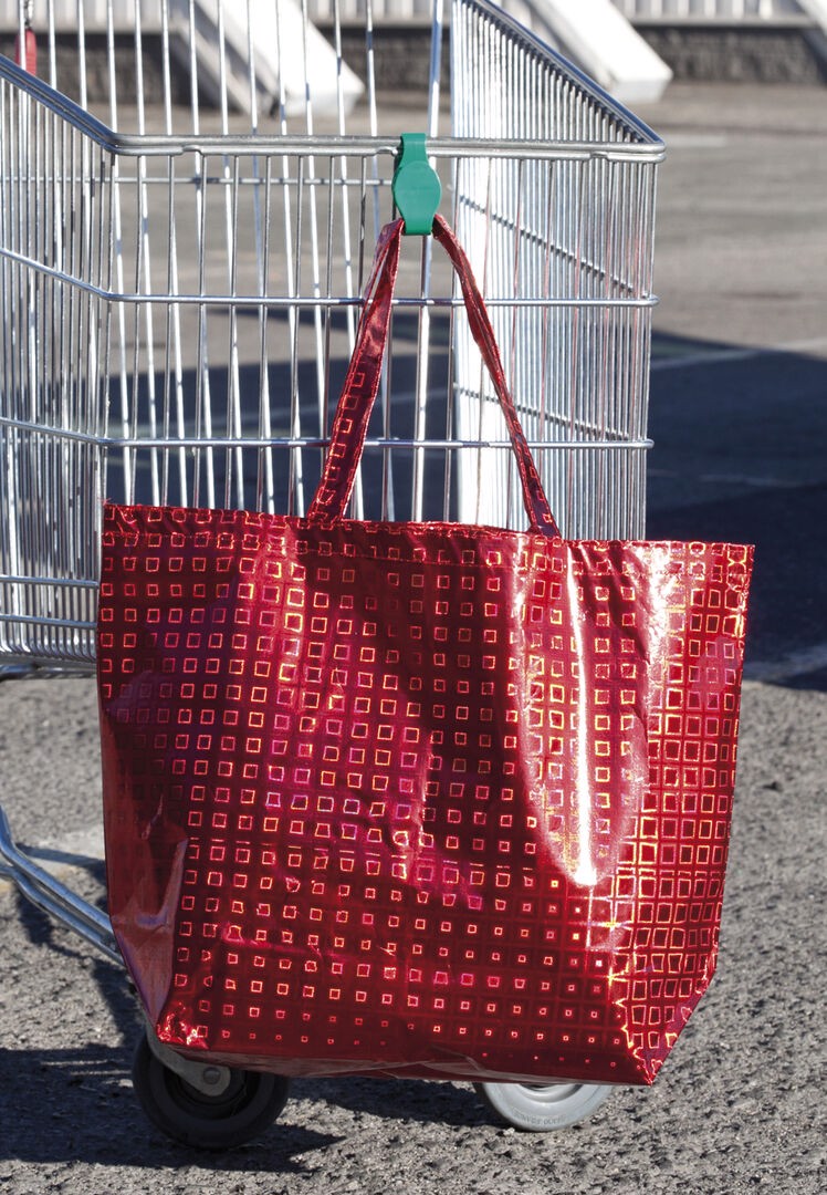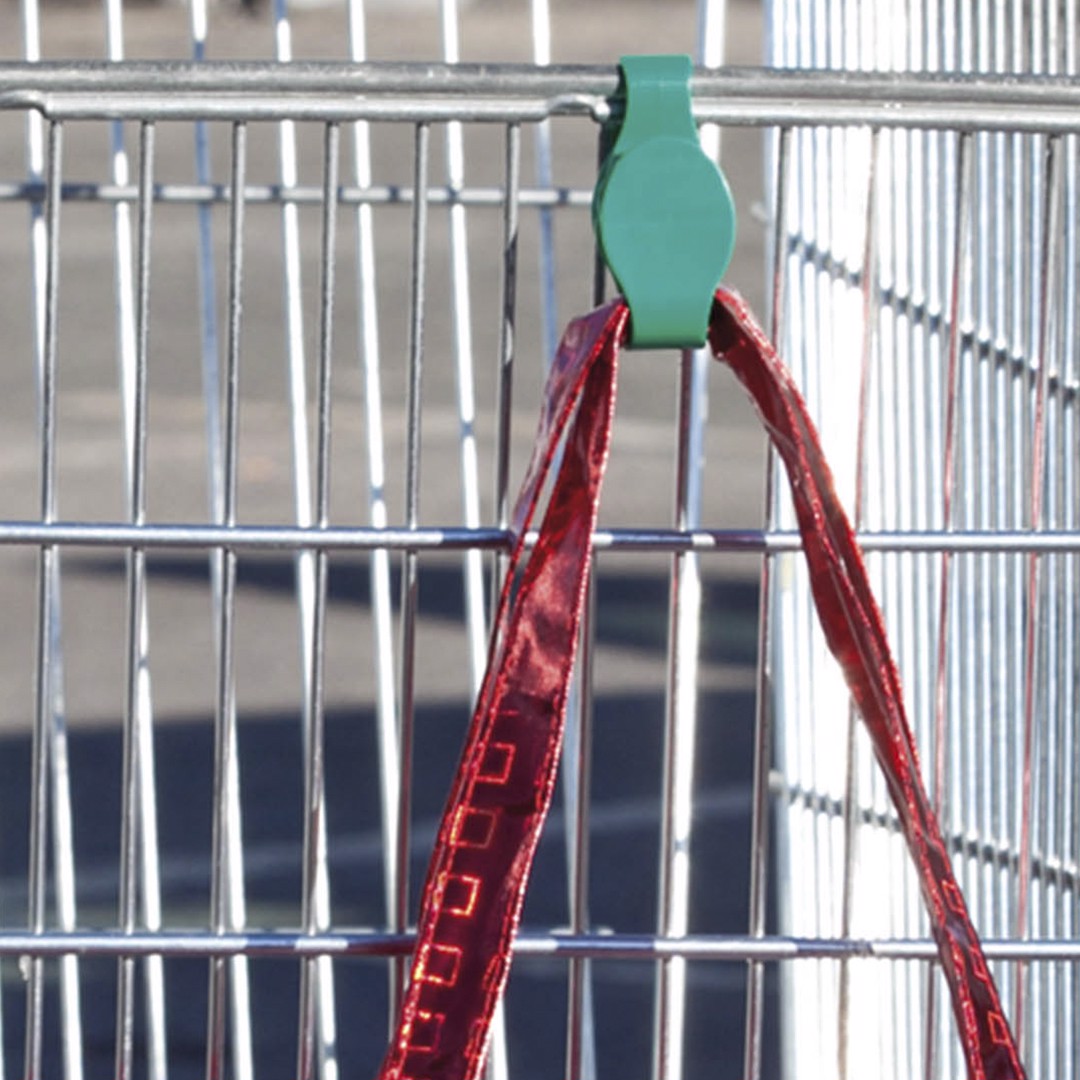 Original and resistant holder for bags in varied and bright tones. With high resistance flange for attaching to any shopping cart.
