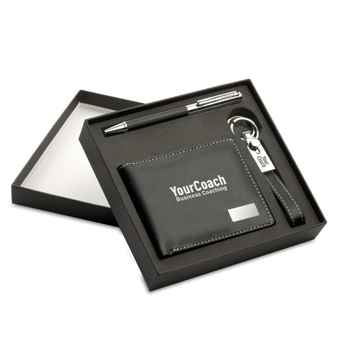 Elegant gift set presented on an EVA tray and carton box. Includes a twist ball pen with blue ink refill, a metal key ring with PU loop and a PU wallet. All PU finish with contrasted stitching.