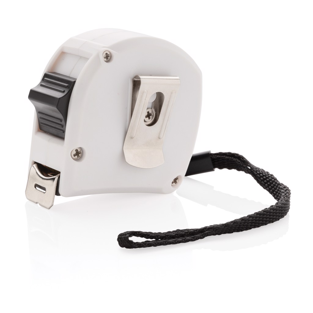 Svinovací metr vyrobený z pogumovaného ABS a dekoru z bambusu. Pásmo s háčkem o délce 5m a šířce 19mm. S klipem, poutkem na ruku a manuální stop funkcí.