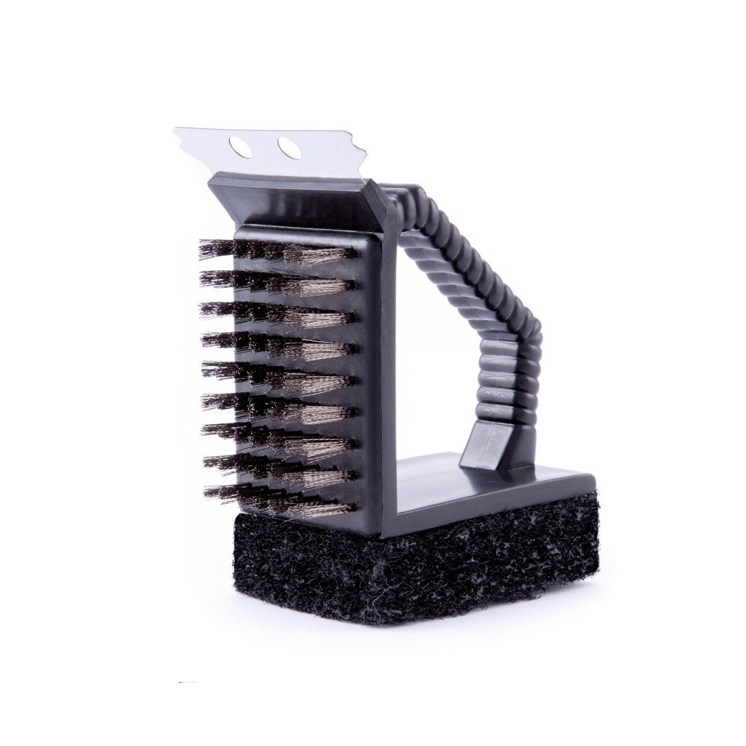 Barbecue cleaner with comfortable handle. With stainless steel spatula, high-resistance scrubber and brush with metallic spikes. Presented in an individual silver plated box. 3 Accessories