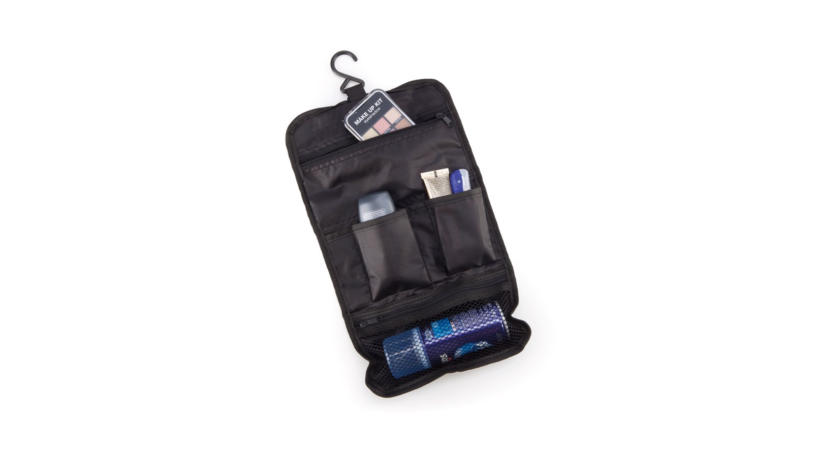 Practical case with hanging hook in resistant 600D polyester with bright tones and black reinforcement piping. Outside zipper pocket and adjustable buckle closure. Soft polyester inside lining with multi-pocket design and mesh compartment.