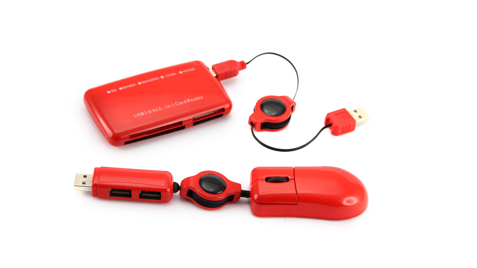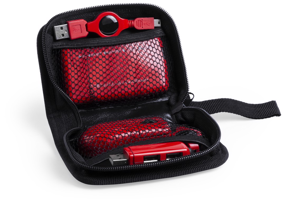 Computer set in an elegant monocolor design. Includes mini optical mouse with retractable cable, dual USB port with card reader: SM, SE/MMC, MS/MMSPRO, and retractable USB data cable. Presented in an elegant and resistant nylon case. 4 Accessories