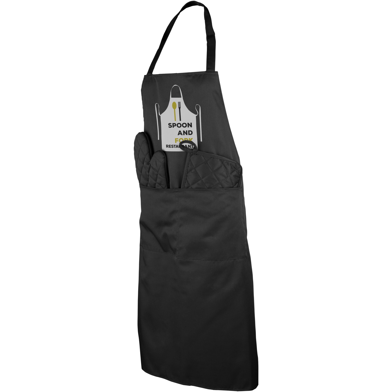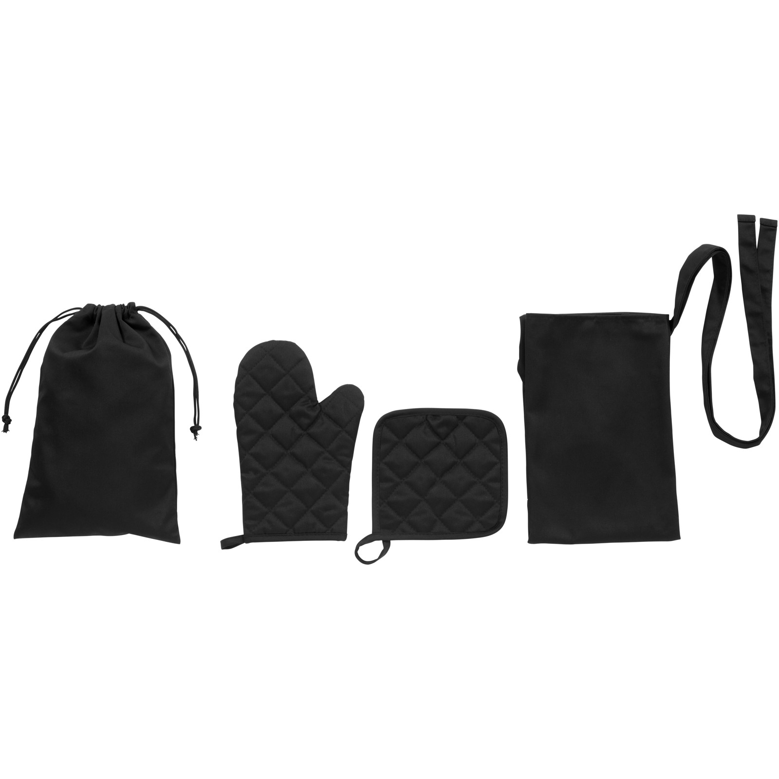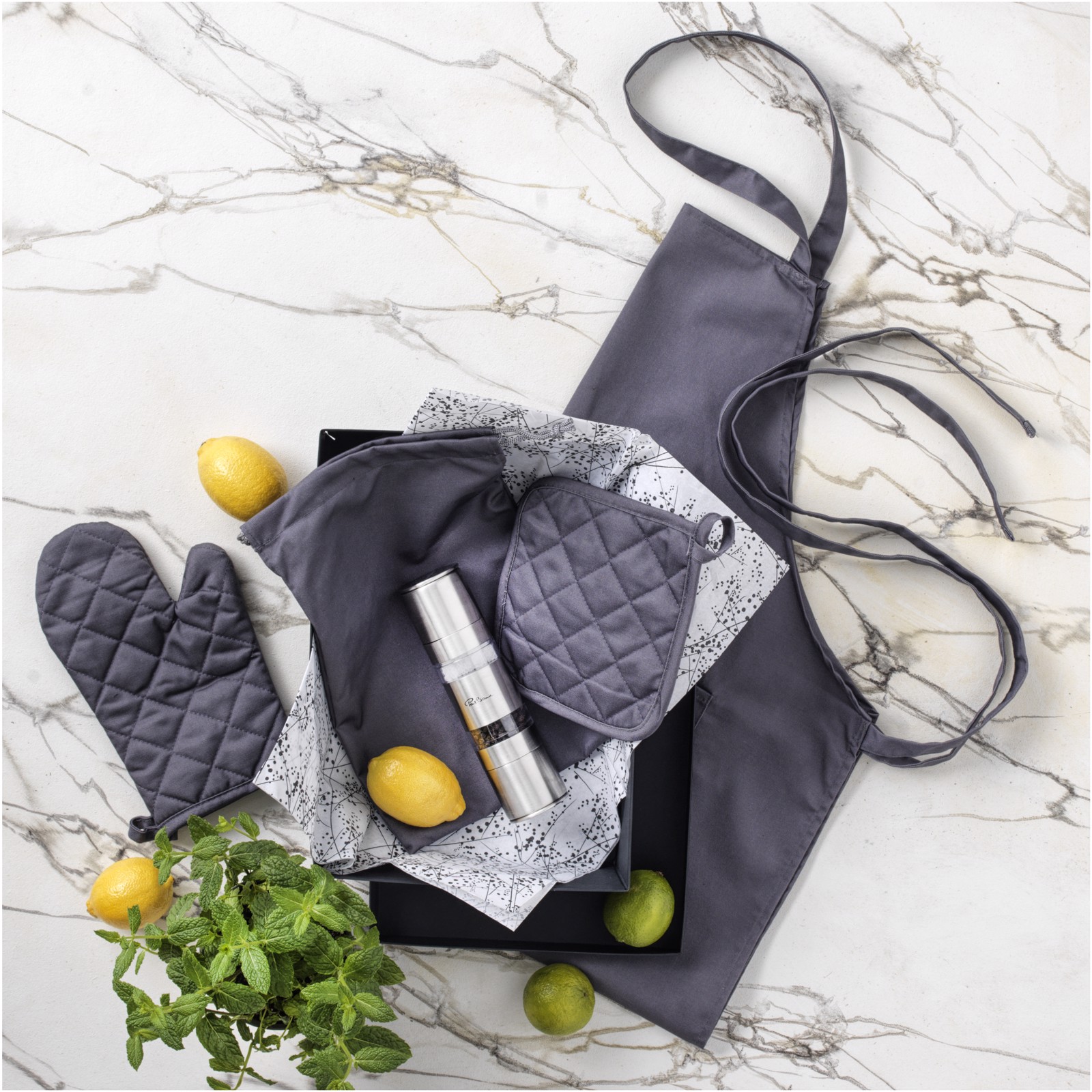 Kuchyňská sada obsahuje zástěru, kuchyňskou chňapku, rukavici a látkovou tašku. Dodává se v černé a šedé barvě.