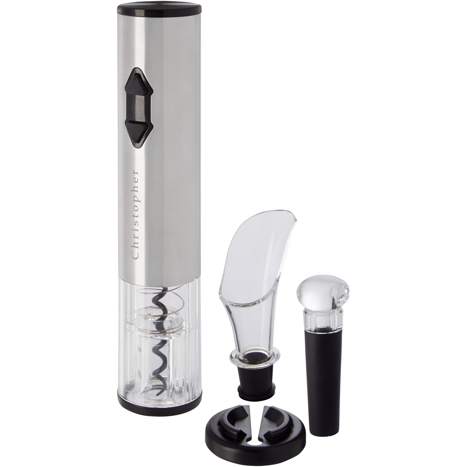 Elektrický otvírák na víno doplněný o řezačku fólií, nalévač a zátku. Funguje na 4 baterie AA (nejsou součástí balení).
