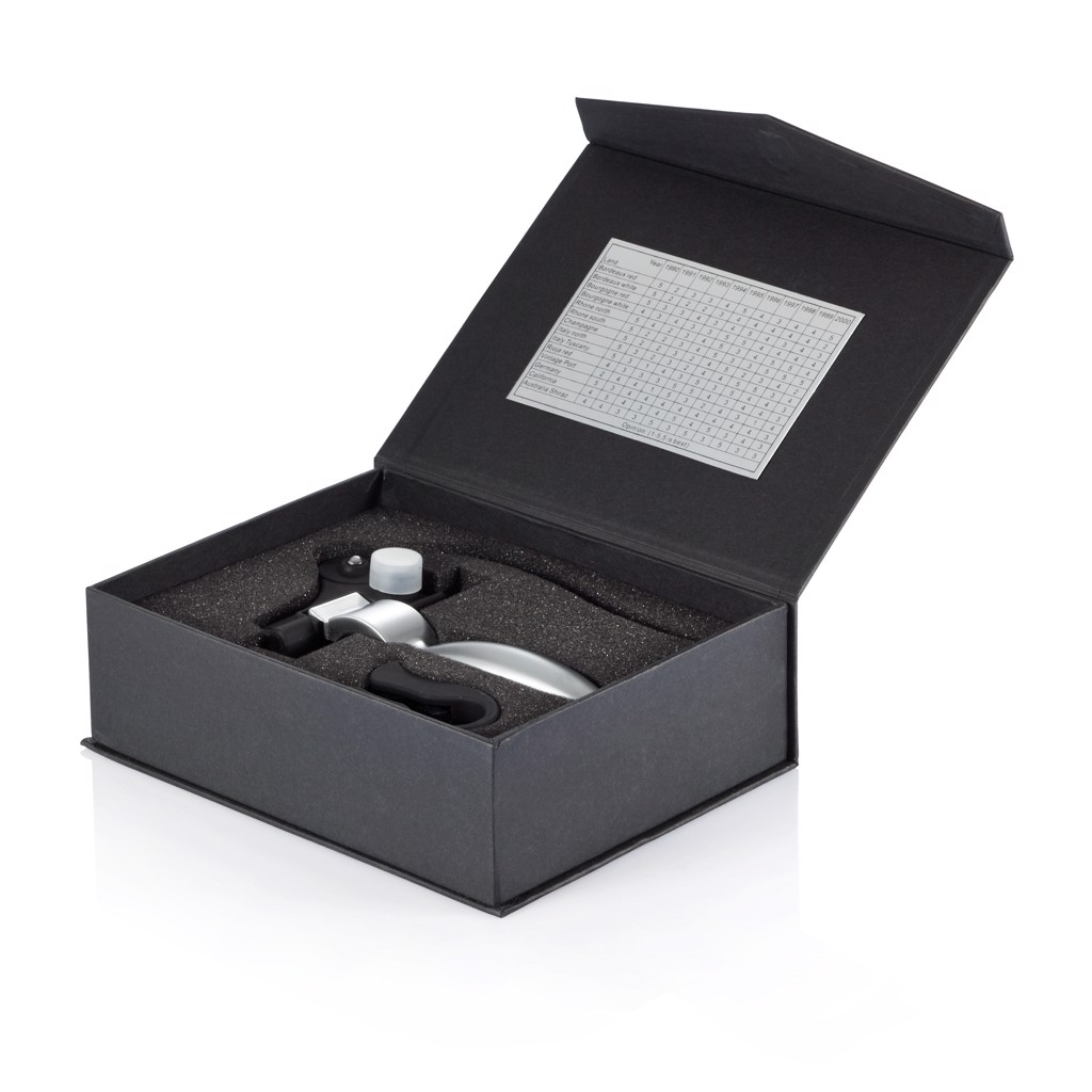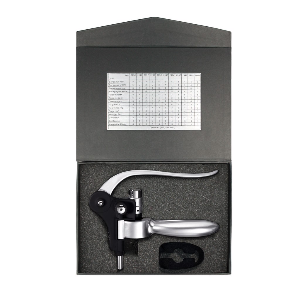 Vývrtka s pákovým mechanismem z hliníku, spirálou z kalené oceli s teflonovým povrchem, včetně ořezávátka fólií a plakety s přehledem nejlepších vinařských oblastí roku 1990.