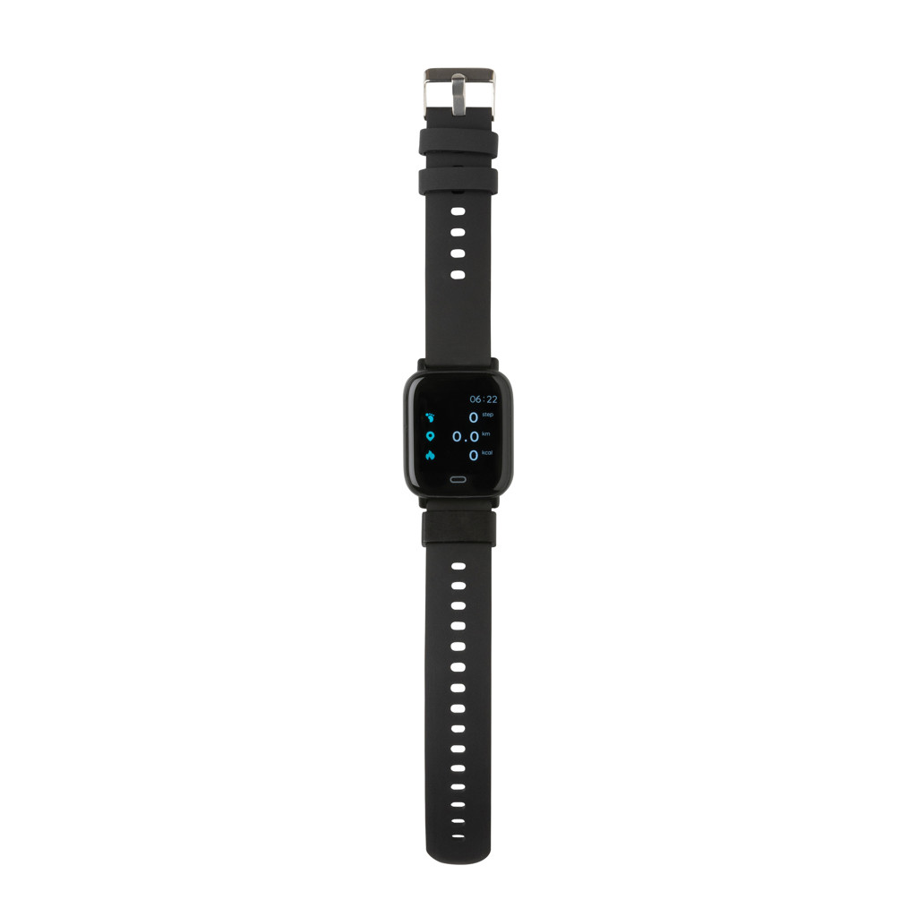 Moderní voděodolné (IPX67) hodinky pro aktivní životní styl s 1,3" point dotykovým barevným displejem. Vyrobené z RCS recyklovaného TPE (pásek) a ABS (rám hodinek). RCS (Recycled Claim Standard) je globální standard, který umožňuje ověřit použití recyklovaného materiálu v produktu napříč celým dodavatelským řetězcem. Celkový podíl recyklátu dle váhy produktu: 31 %. Funkce zahrnují: sledování spánku, krokoměr, měření vzdálenosti, počítání spálených kalorií, měření srdečního tepu, krevního tlaku, Multi-sport režim, budík, kalendář, notifikace: SMS, Facebook, Skype, WhatsApp a další. Integrovaný mikrofon pro telefonování. Kompatibilní s iOS 8.0 a výše a Android 4.0 a výše skrze BT 5.0. Pohotovostní režim: 15 dnů, pracovní režim: 5 dnů. Baleno v FSC® kraftové dárkové krabičce. Produkt i příslušenství bez PVC.
