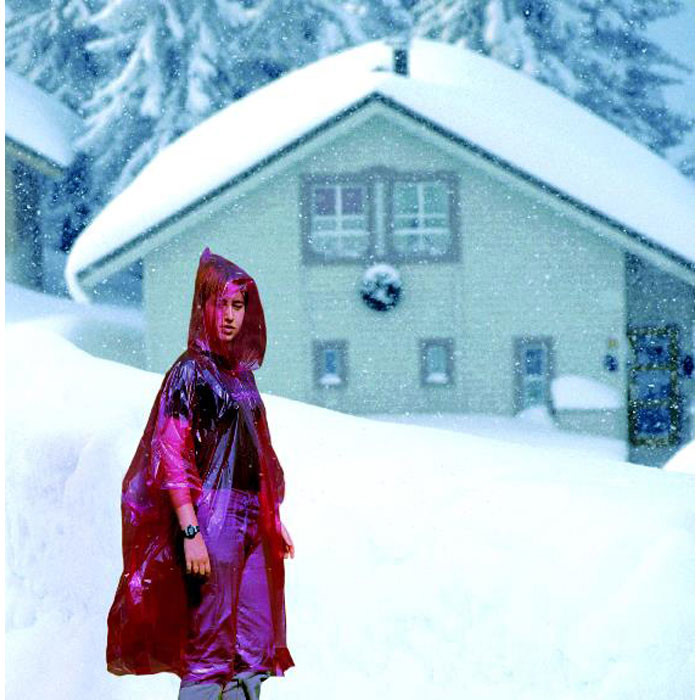 Foldable plastic poncho with attached hood, packed in a transparent polybag.