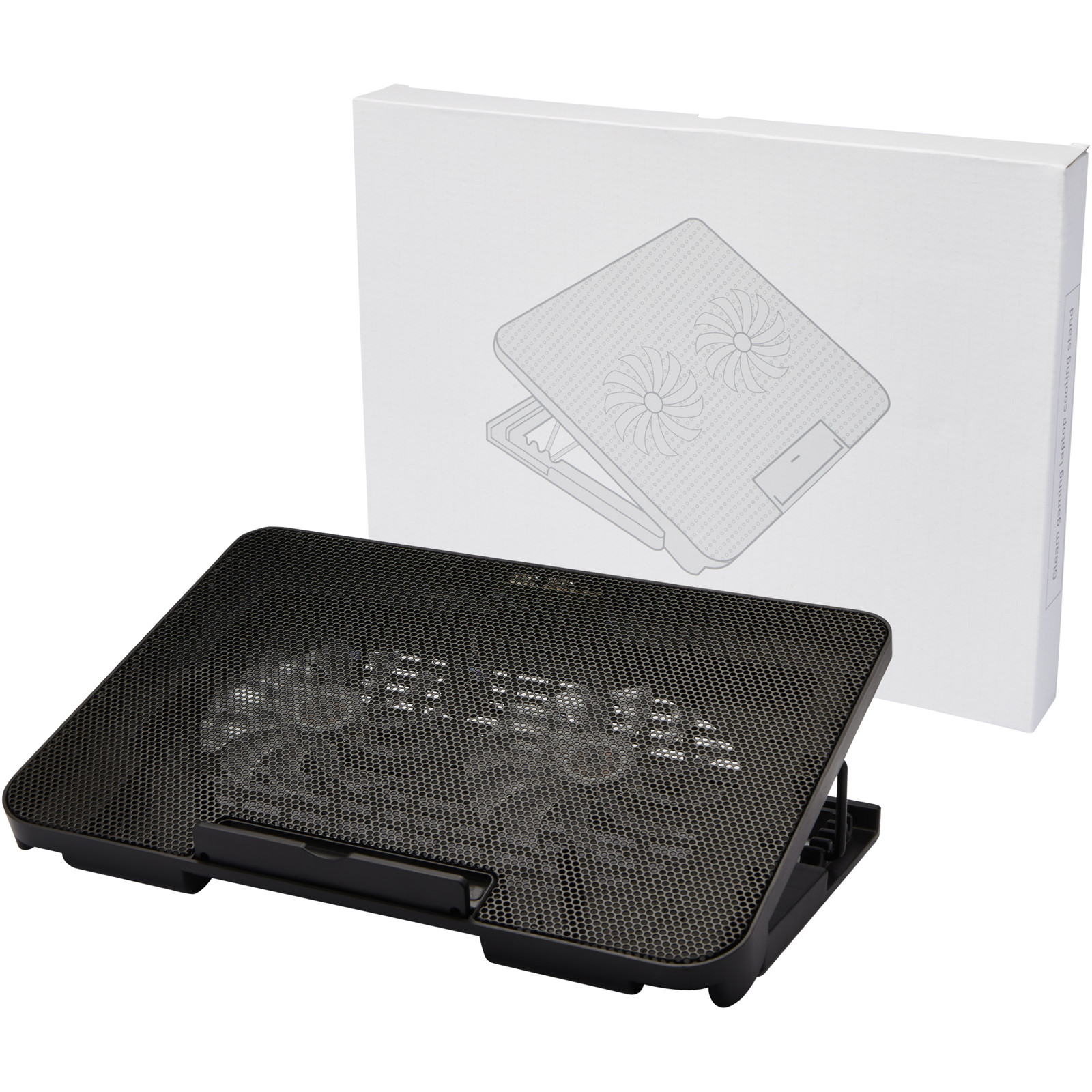 Laptop cooling stand with 4 levels of adjustable height settings to play games or watch movies at the most comfortable angle (10°- 23°). Two silent fans provide a strong air flow to prevent the laptop from overheating. Large flat surface that is compatible with most laptops in the market, and it can hold maximum 20kg of weight. The stand can be folded up entirely for easy transport. Integrated with 2 USB ports which can be used as a USB hub with USB 2.0 support up to 60MB/s transmission. Delivered in gift box made of sustainable material.