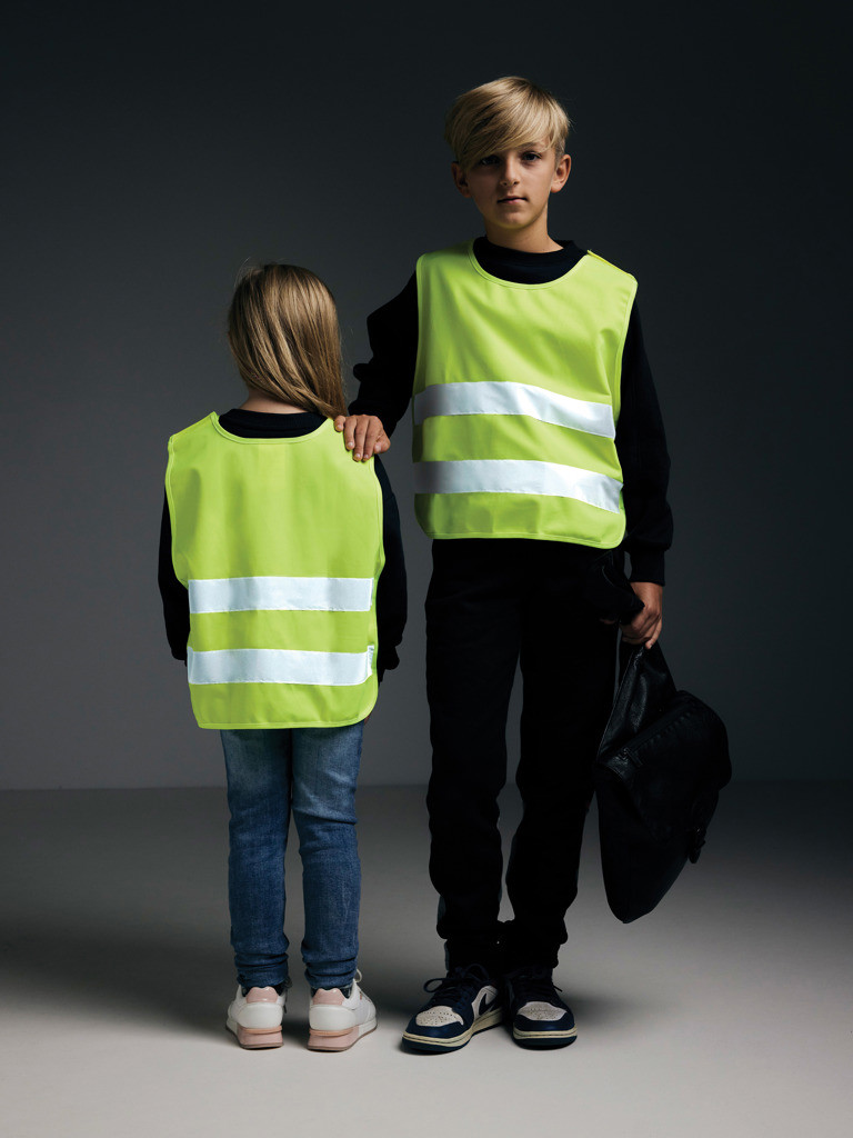 XS-sized high-visibility vest designed for children aged 3 to 6, with a height range of 90 to 140 cm. This vest features space for decoration on both the front and rear sides. It is equipped with hook and loop closures on the shoulders and at the bottom for added safety and easy donning. The elastic bands on the opposite side provide flexibility, allowing it to be comfortably worn over thick coats. This vest has rigorous testing and complies with EN 17353:2020 Type AB3. Furthermore, it adheres to the PPE guidelines specified in Regulation (EU) 2016/425 for Personal Protective Equipment Category II. Made with GRS certified recycled PET. Total recycled content: 55% based on total item weight. GRS certification ensures a completely certified supply chain of the recycled materials.