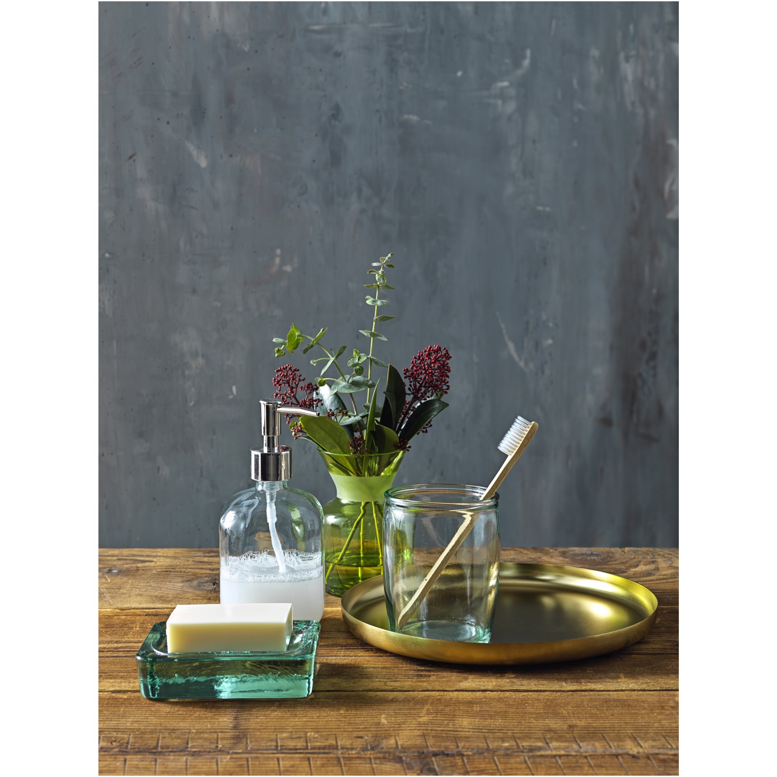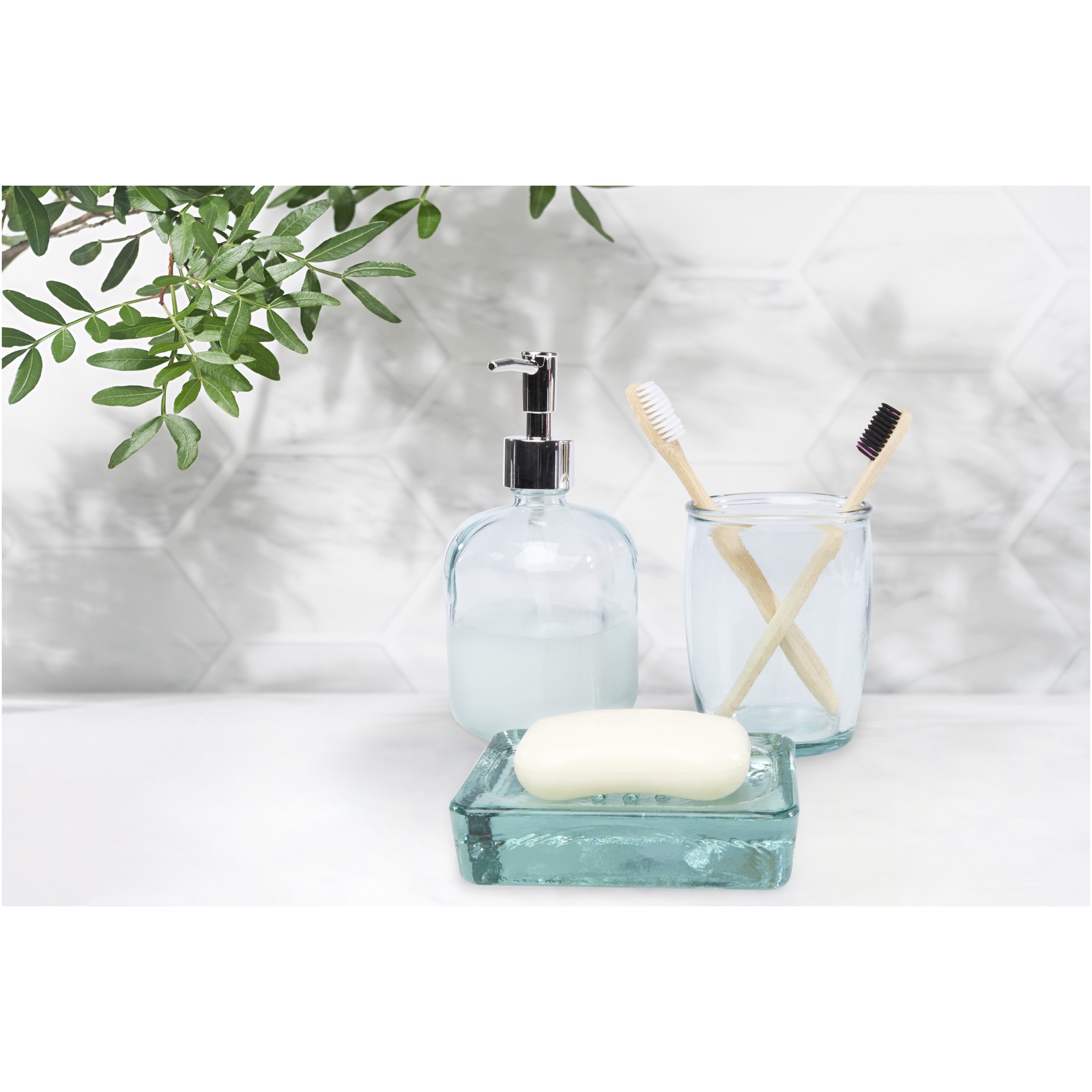 3-piece 100% recycled glass bathroom accessory set with a soap dispenser (450 ml), a tumbler (430 ml), and soap dishware (13 x 10 cm). Recycled glass is manufactured using less energy, raw material, and additives, than what is required for making traditional glass. Dishwasher safe.