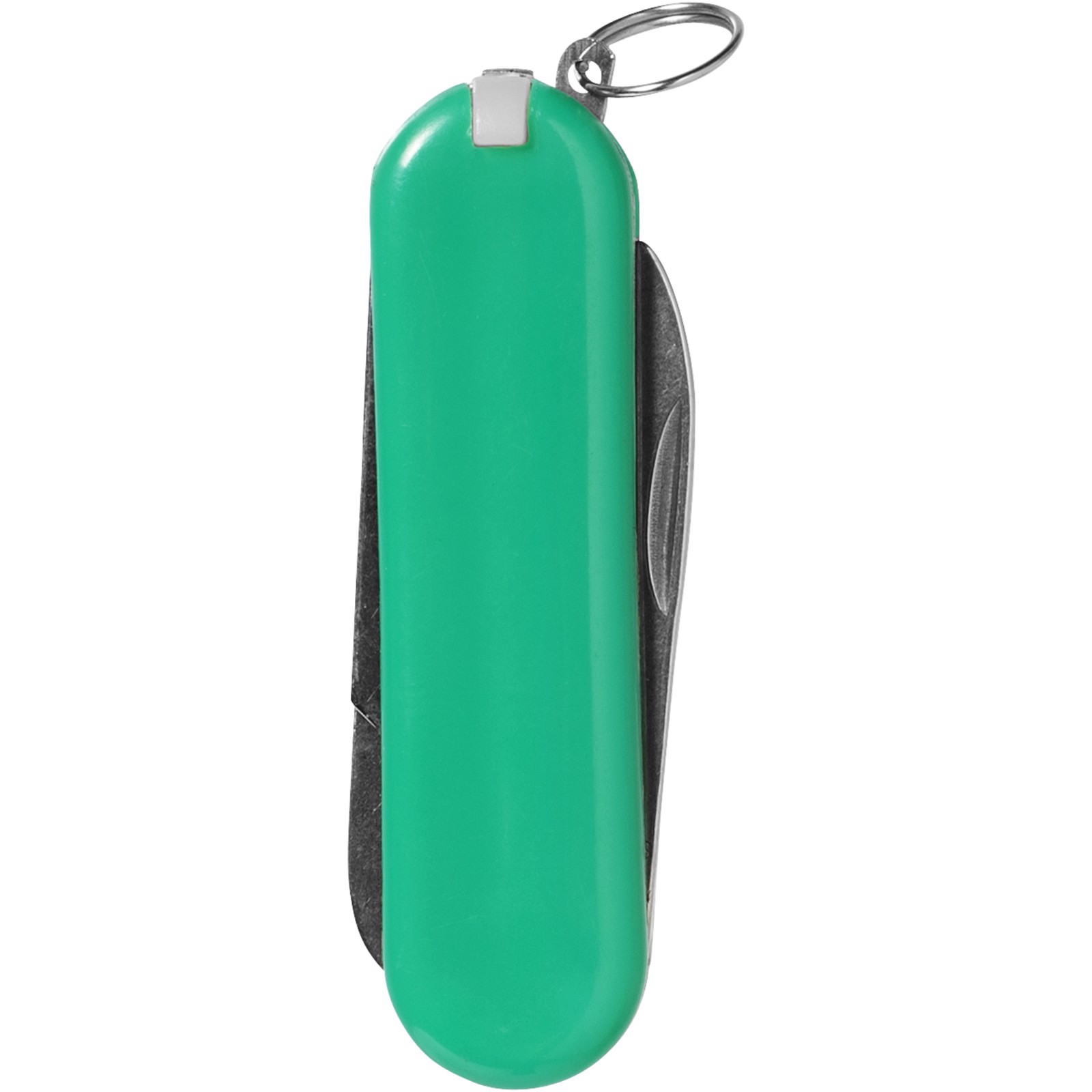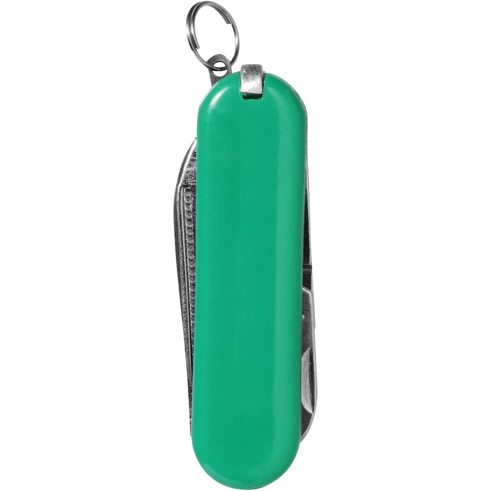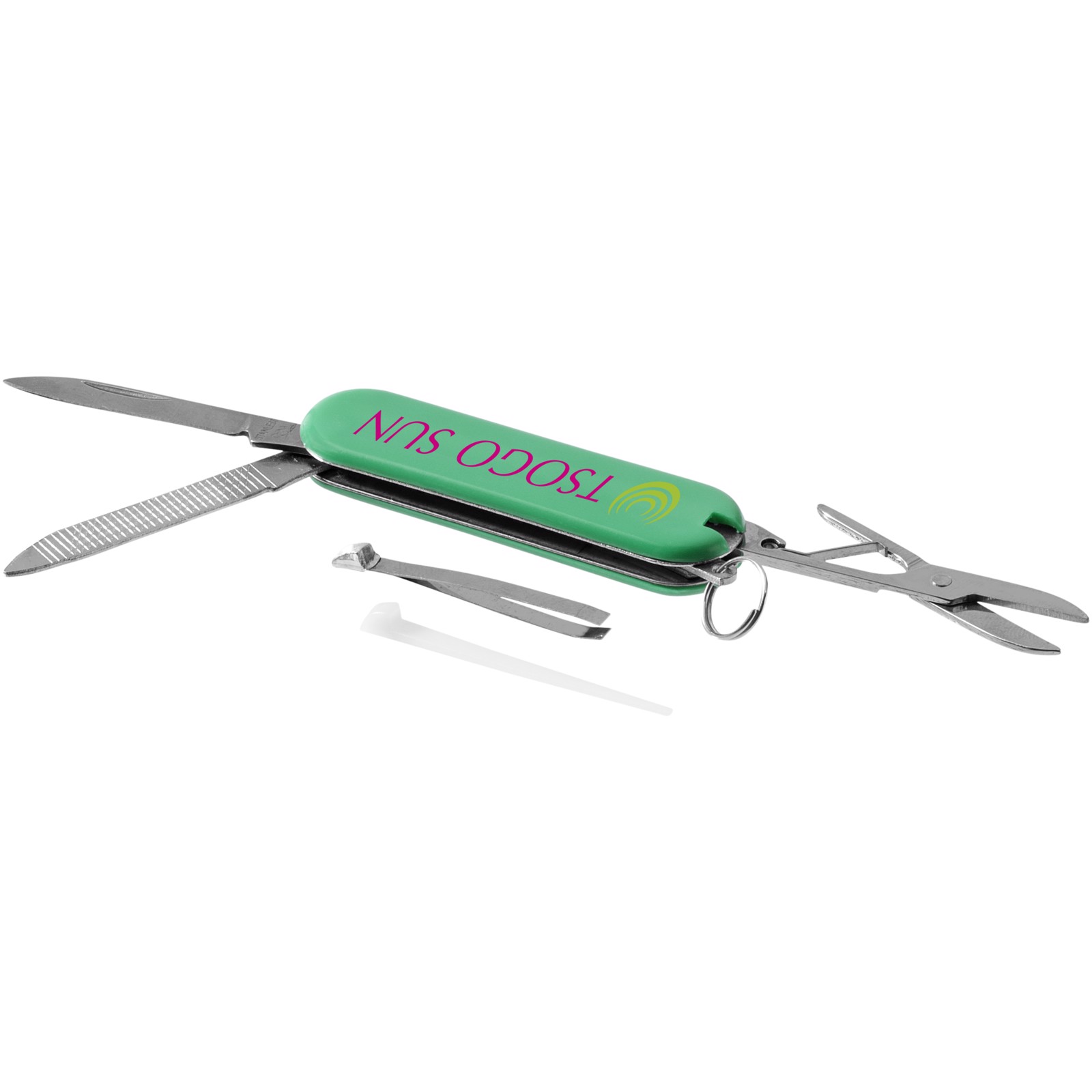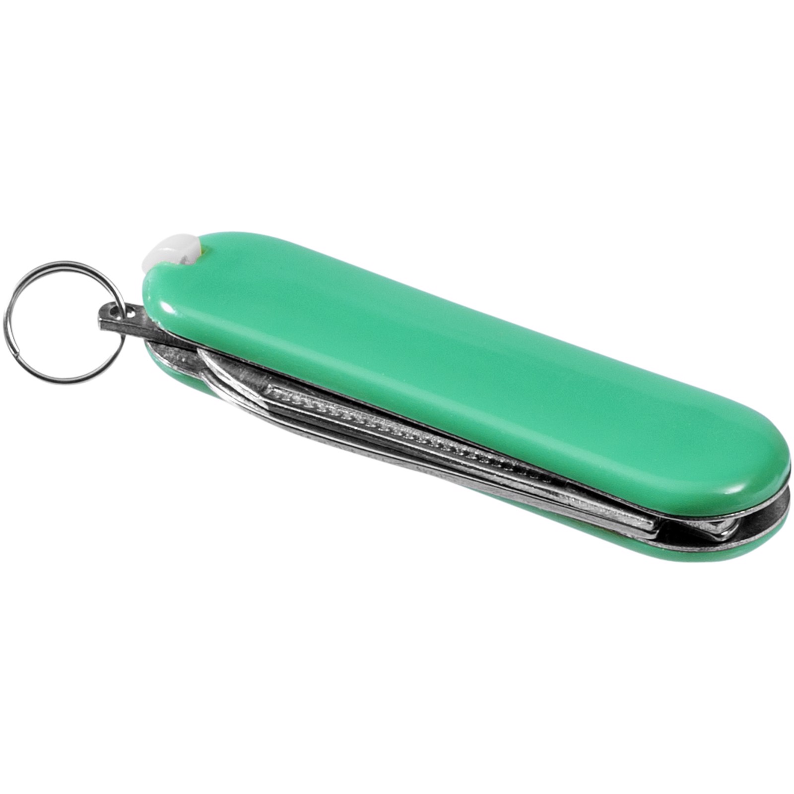 Kapesní nůž s nožem, nůžkami vybavenými pružinou, pinzetou, párátkem, pilníkem na nehty a malým dvojitým kovovým kroužkem na klíče.