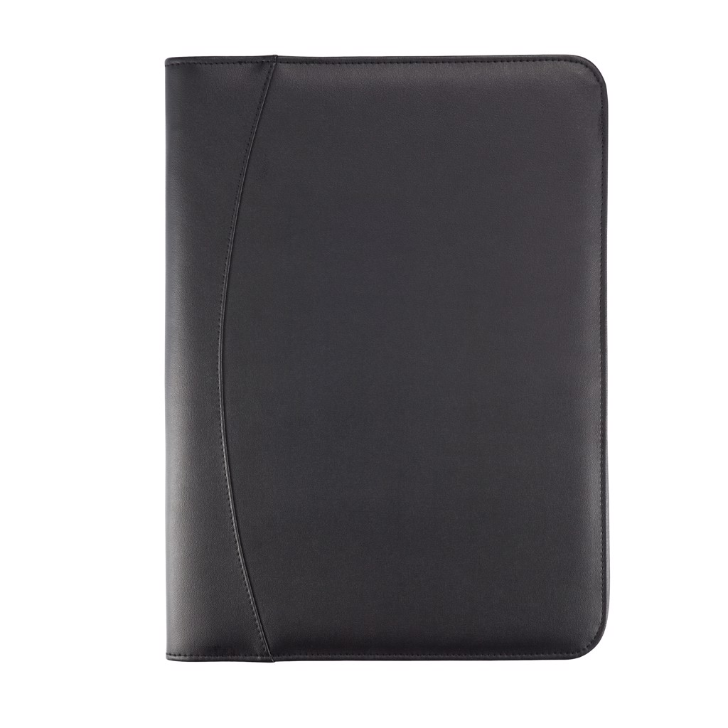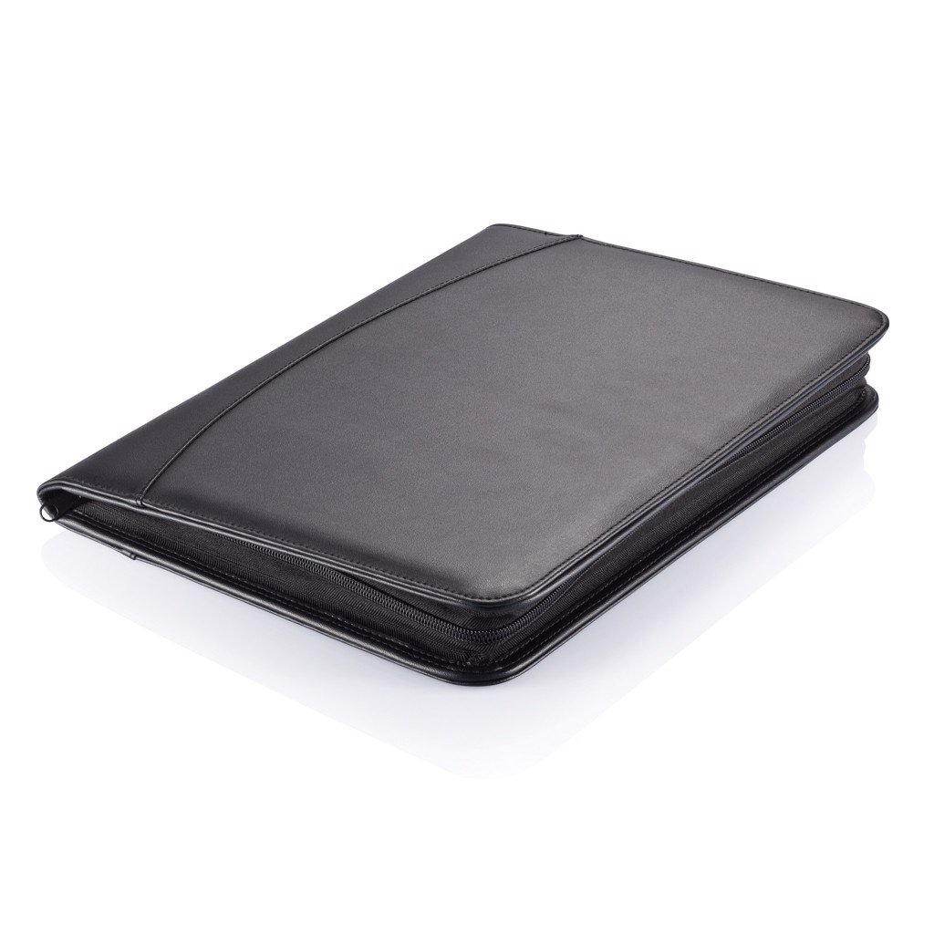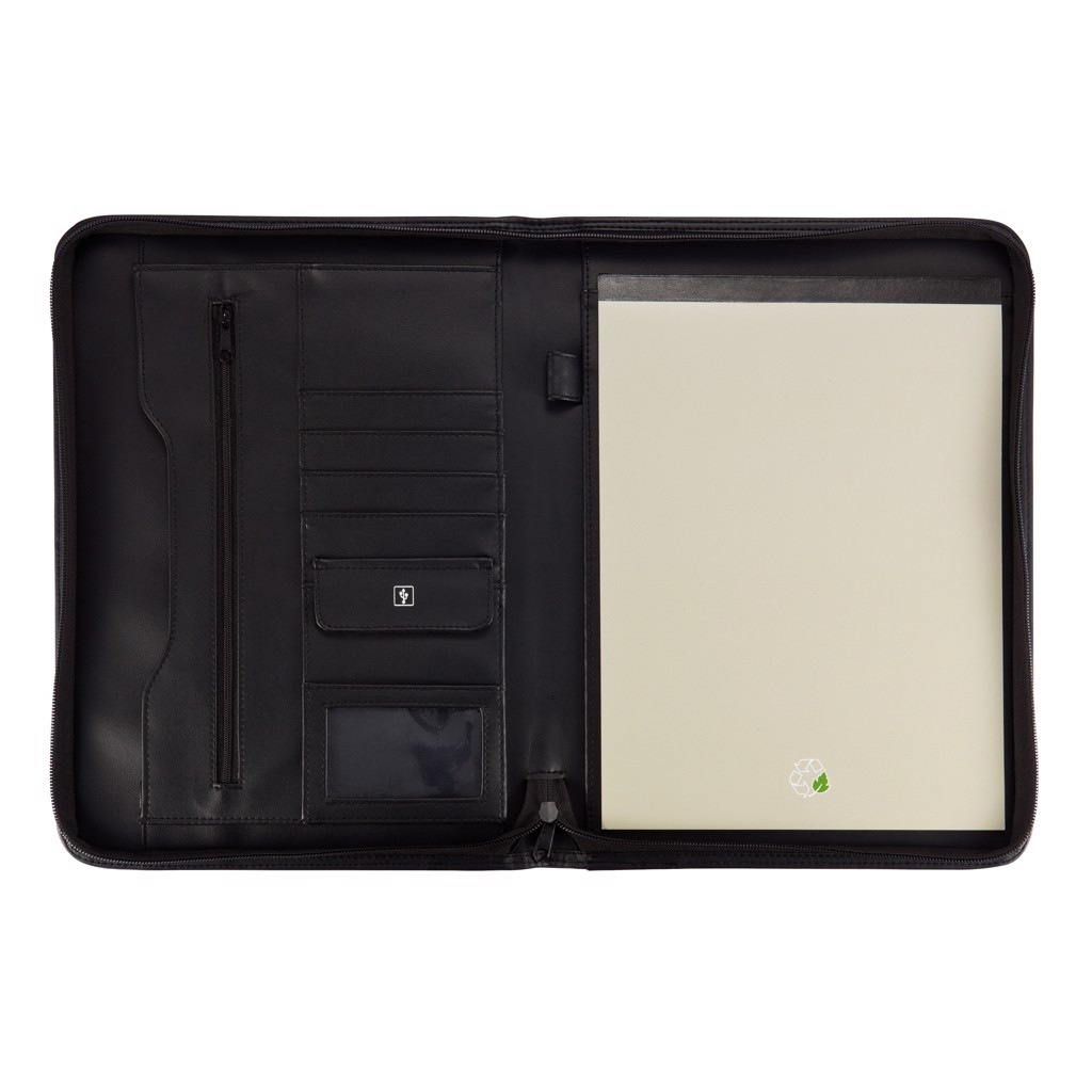 Desky se zavíráním na zip, kapsa na zip a zasunovací kapsa uvnitř, 4 přihrádky na karty, USB kapsa a držák per, včetně zápisníku A4 s béžovým obalem, 20 listů recyklovaného papíru s logem recyklace.