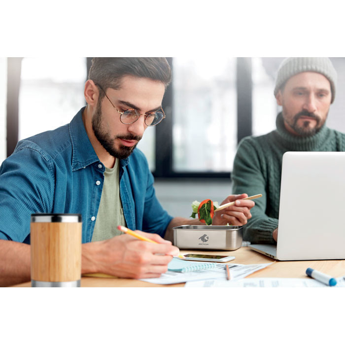 Nerezová obědová krabička s bambusovým víkem, 2 příbory a krycí pásek. Objem 600 ml. Bambusje přírodní materiál, víka se mohou lišit.
