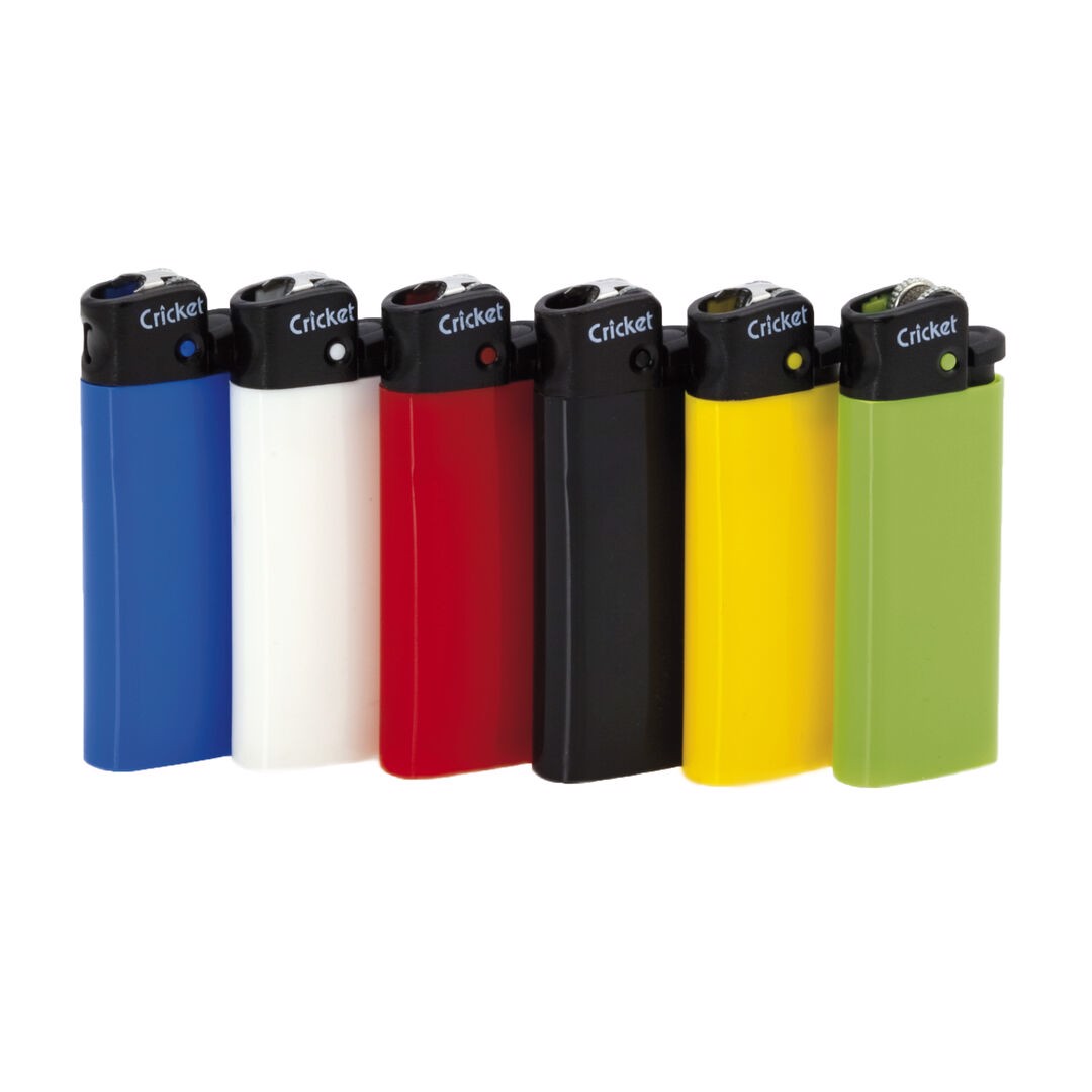 Mini gas lighter by Cricket. Flint mechanism in a varied range of bright tones. With child protection.