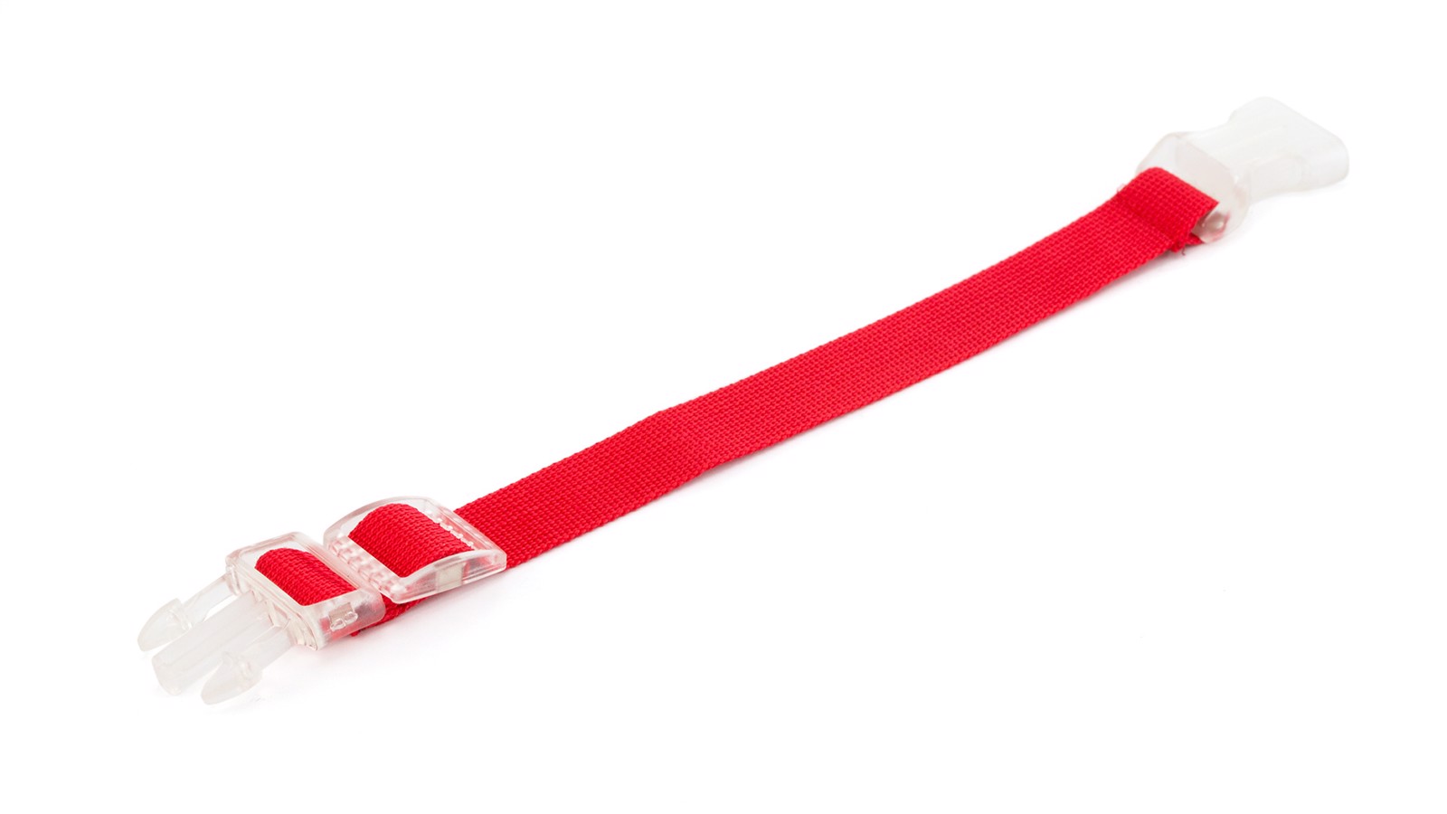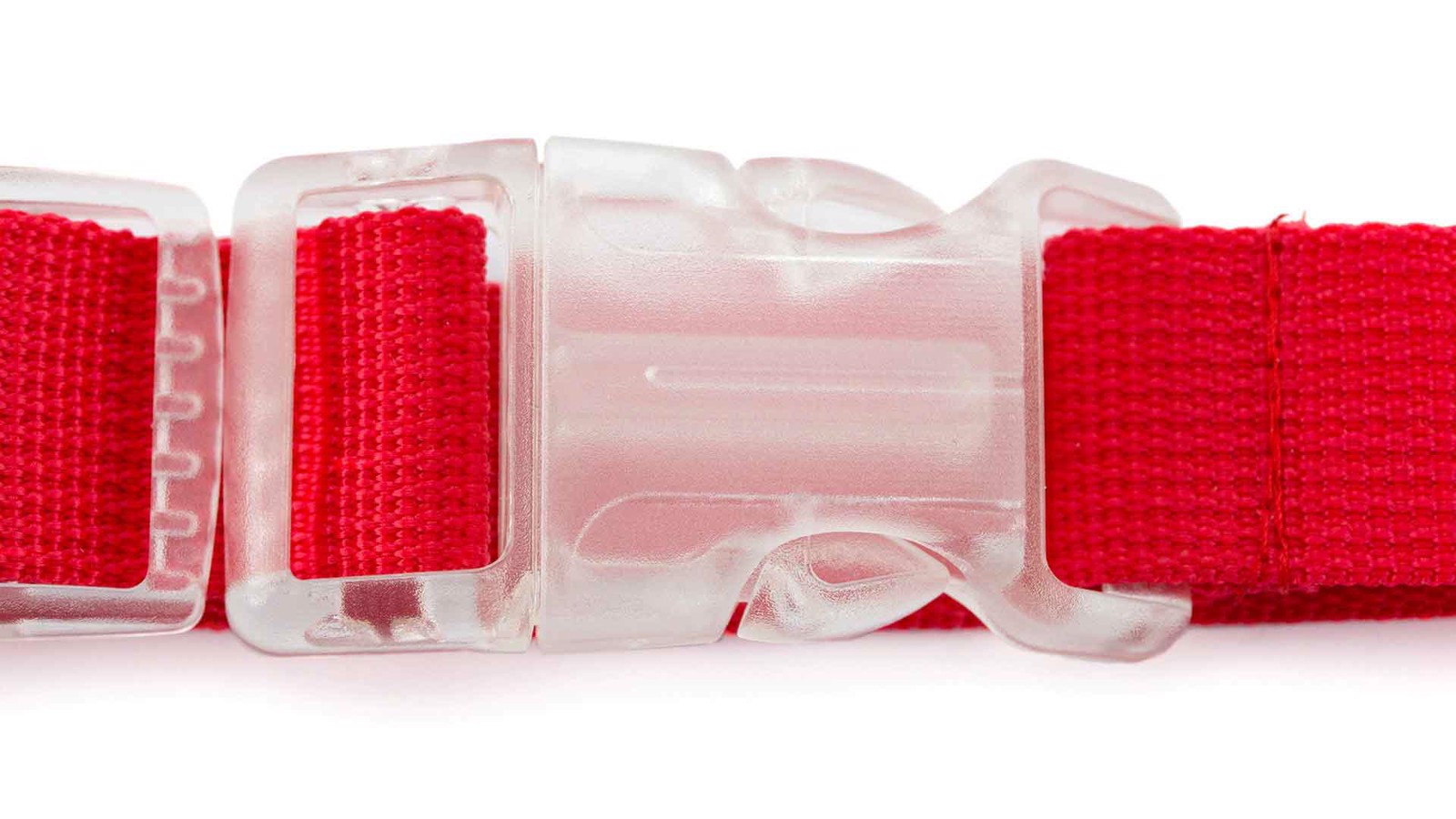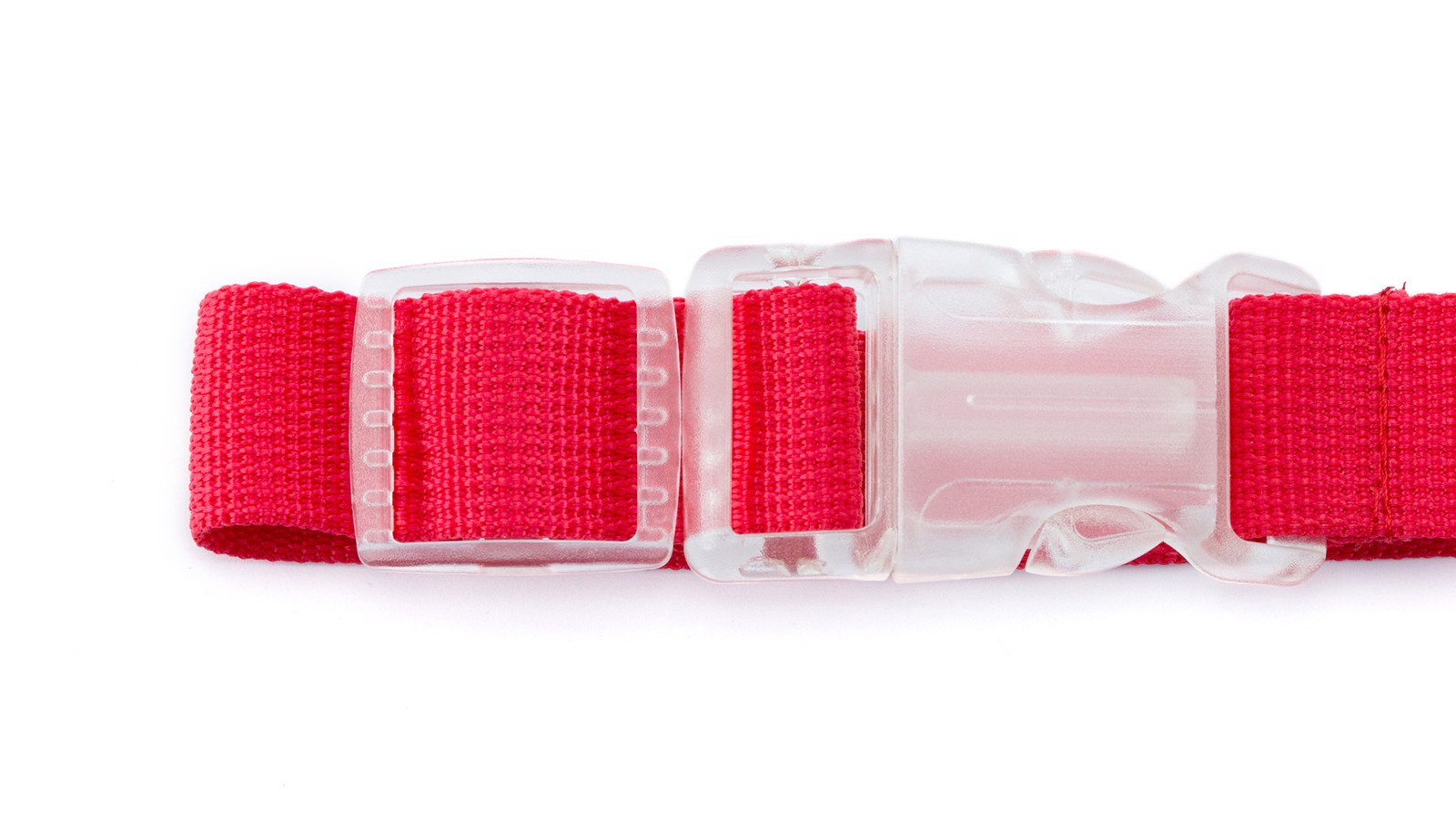 Resistant polyester luggage strap in brightly colored finish. With buckle closure and adjustment accessory in transparent finish.