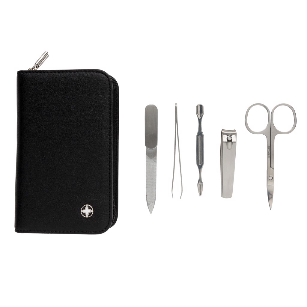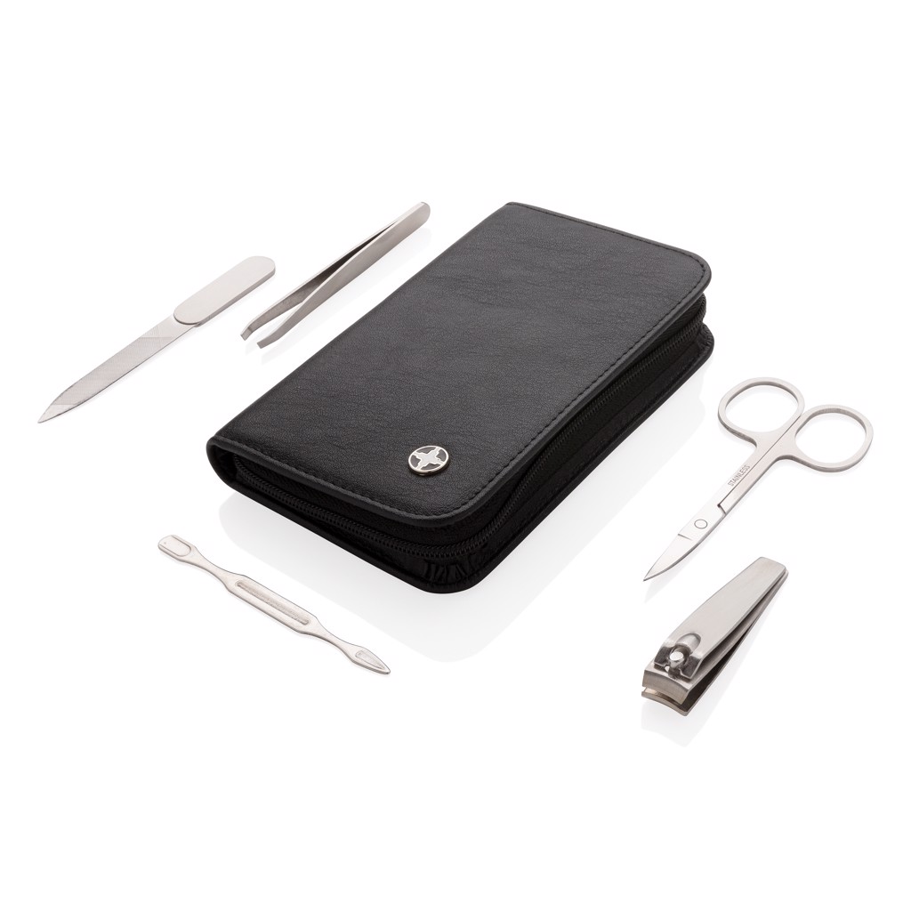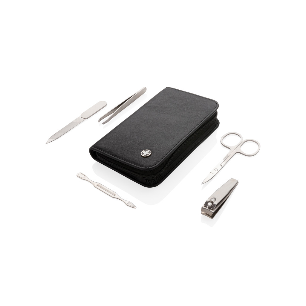 Praktická manikúrní sada Swiss Peak obsahující kleštičky na nehty, nůžky, pilník, pinzetu a nástroj na úpravu kůžičky. Celá sada nástrojů je vyrobena z matné nerezové oceli. Baleno v elegantním pouzdře z umělé kůže (PU).