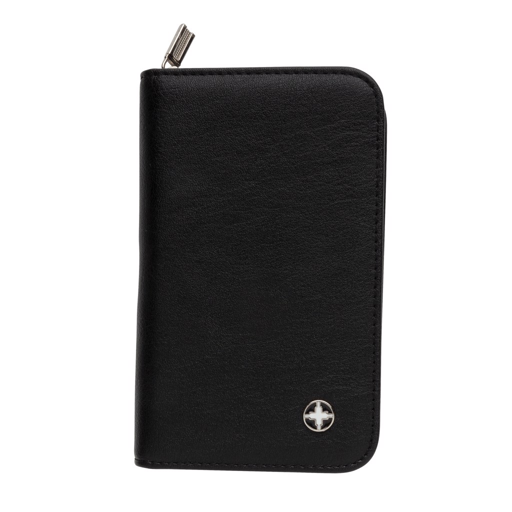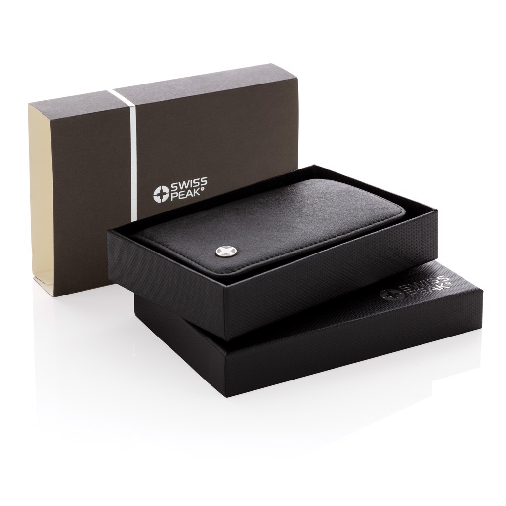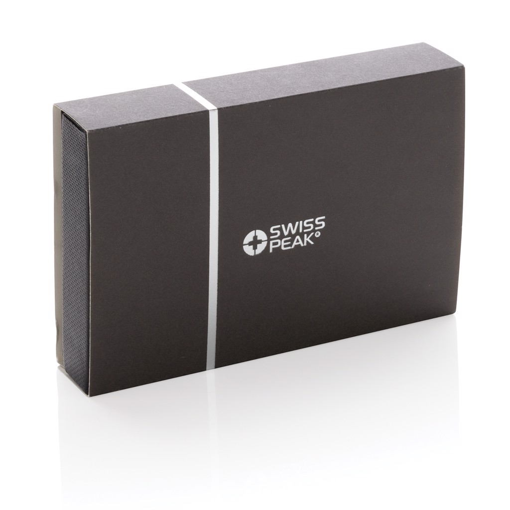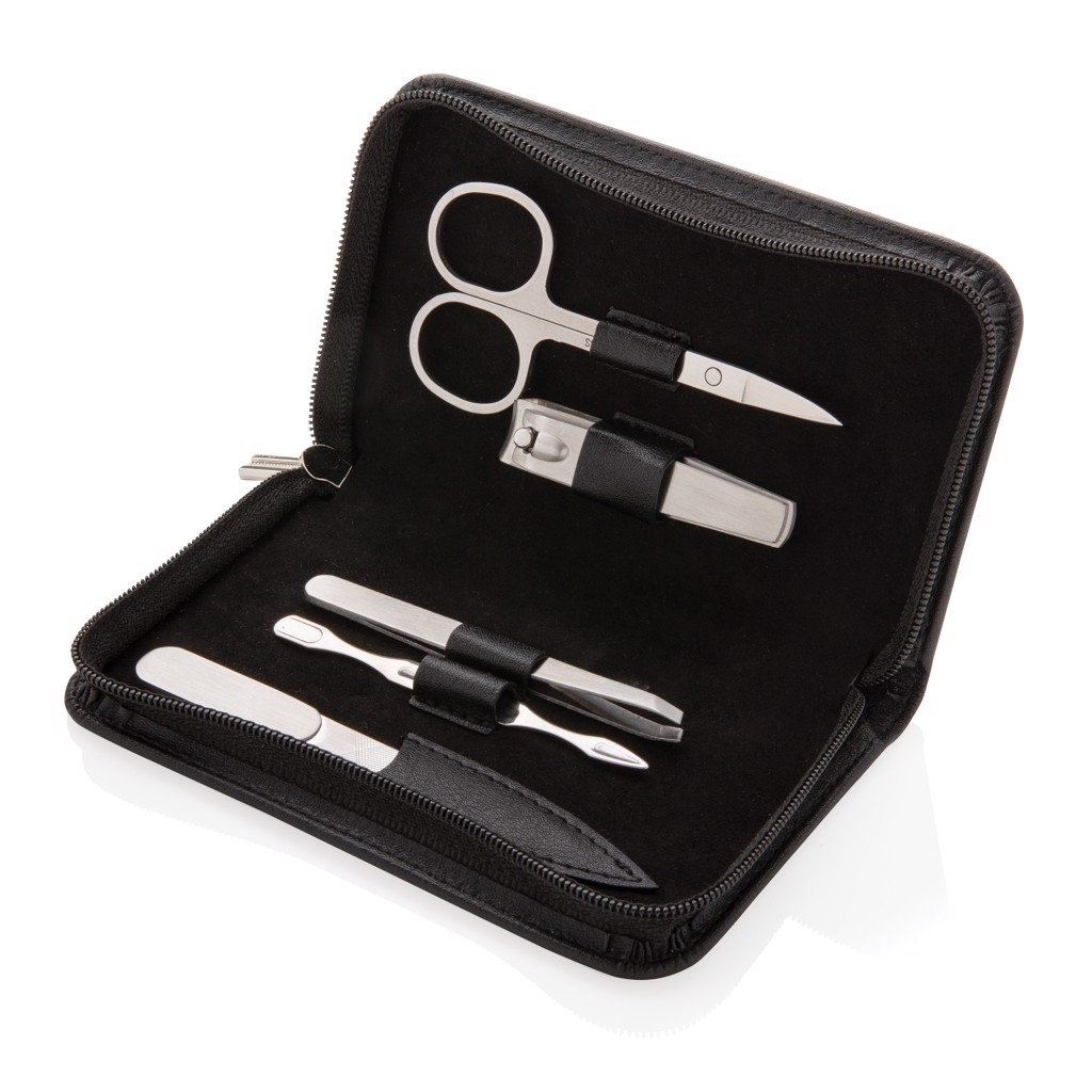 Praktická manikúrní sada Swiss Peak obsahující kleštičky na nehty, nůžky, pilník, pinzetu a nástroj na úpravu kůžičky. Celá sada nástrojů je vyrobena z matné nerezové oceli. Baleno v elegantním pouzdře z umělé kůže (PU).