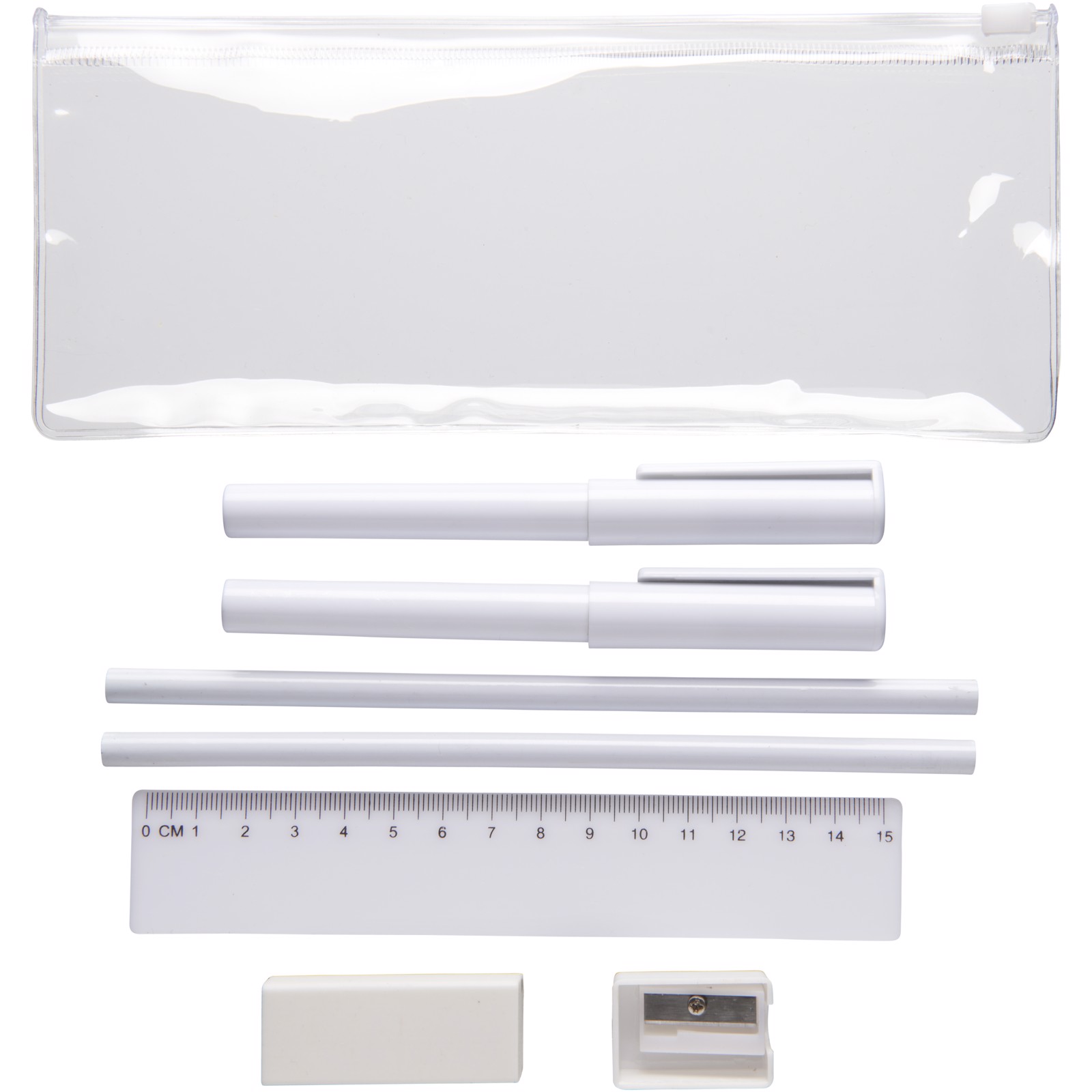 PVC penál se dvěma kuličkovými pery (1 s černým inkoustem, druhé s modrým), 2 tužkami, pravítkem, ořezávátkem a gumou.