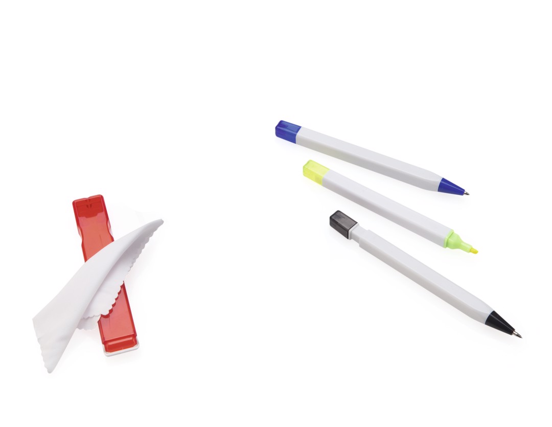 Original folding holder for smartphone, in an original bicolor design with adhesive surface. Including set with fluorescent marker, ball pen, pencil and cleaning cloth with cover, all of them integrated at the backside. 5 Pieces. Sticky Surface. Cleaning Cloth Included