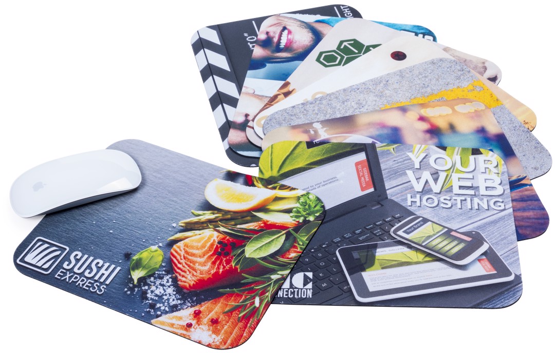 Square design mousepad in soft polyester with bright tones and silicone non-slip base.