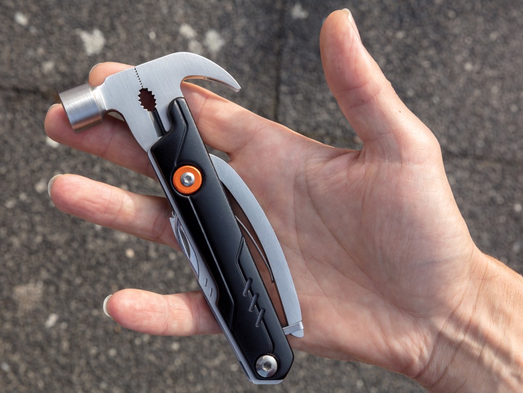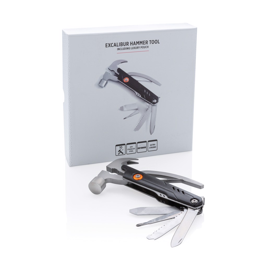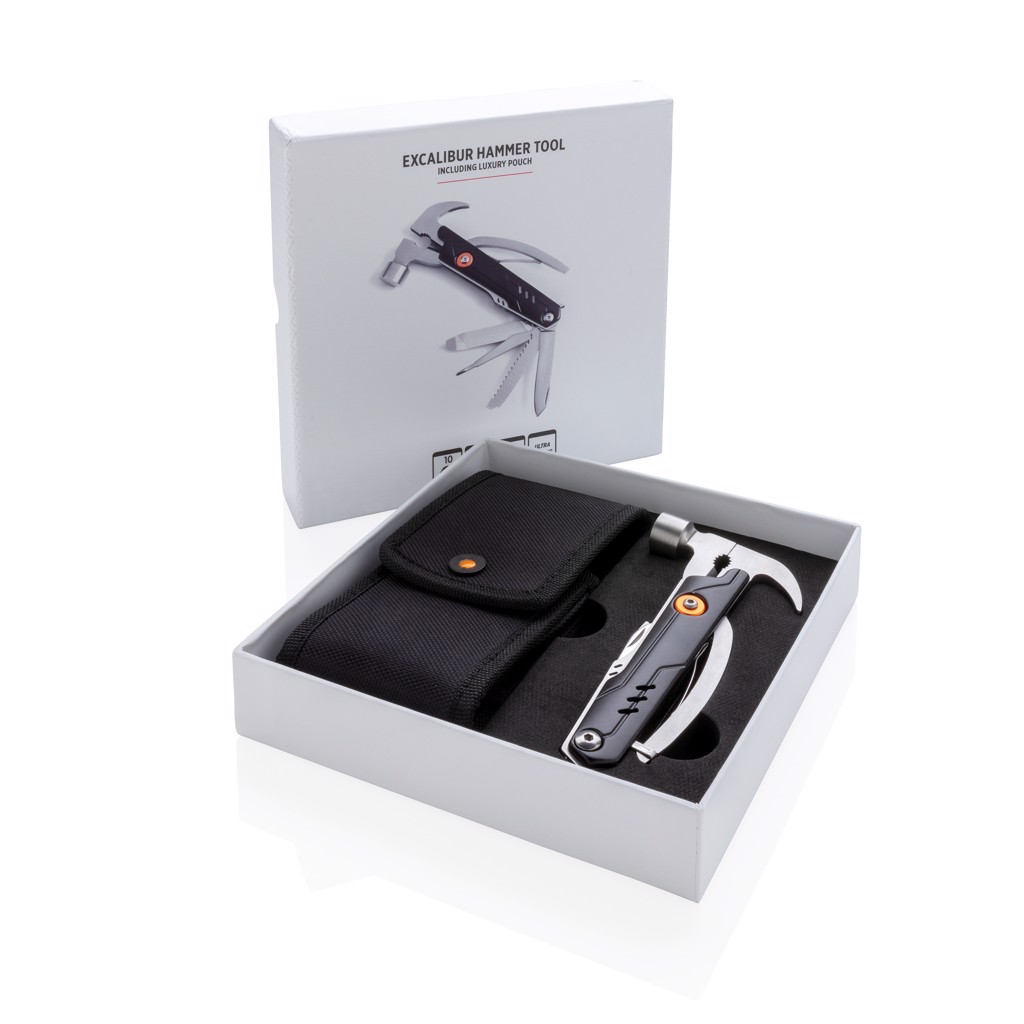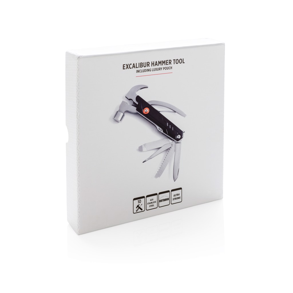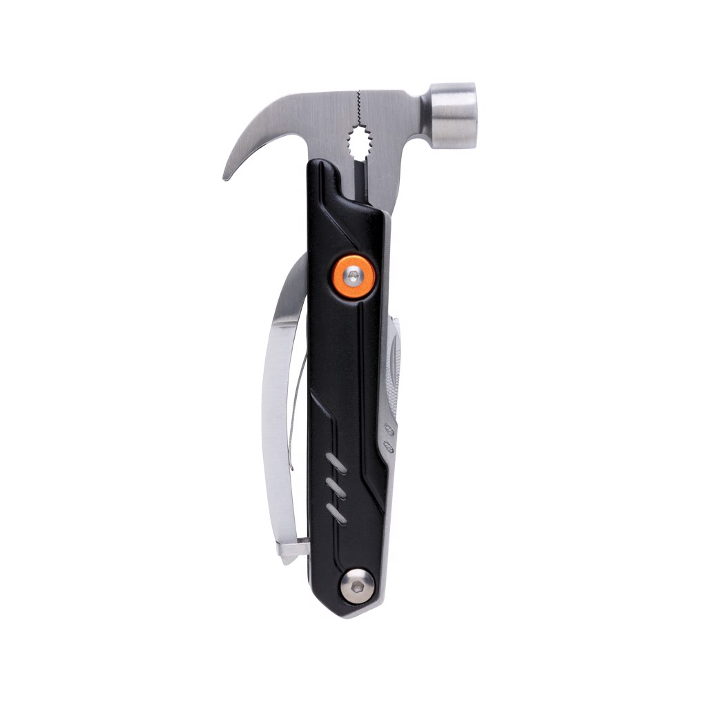 Extrémně pevný multifunkční nůž s 10 funkcemi: kladívko, kombinační kleště, štípací kleště, vytahovák hřebíků, nůž, pilka, pilník, plochý šroubovák, křížový šroubovák, otvírák. Tělo z hliníku, nástroje z nerezové oceli. Baleno v luxusní krabičce s vysoce kvalitním 1680D pouzdrem.