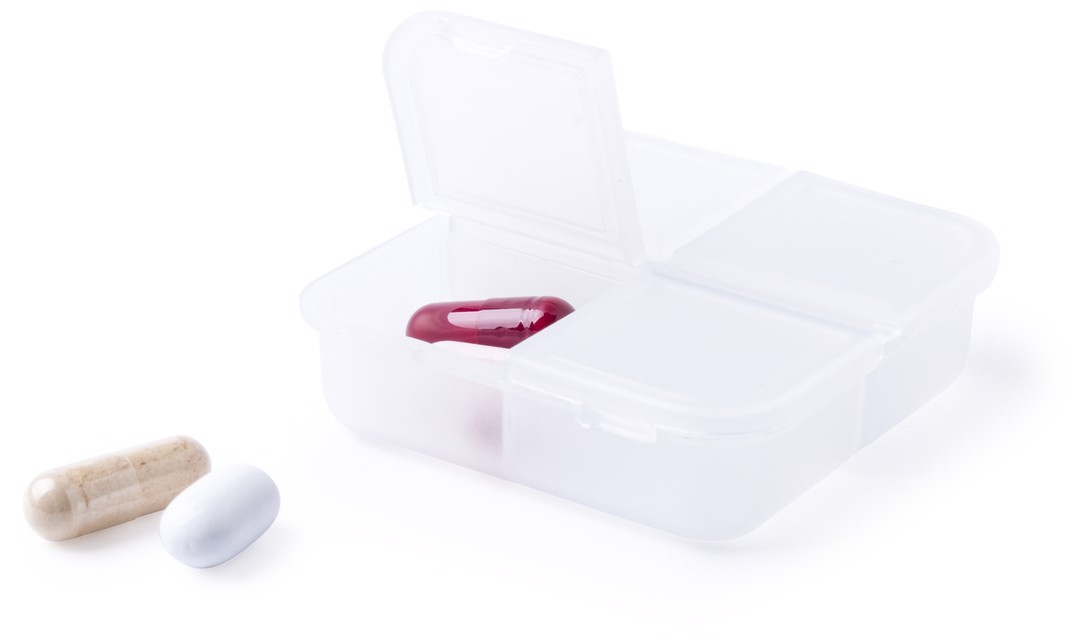 Pill box with 4 compartments in translucent finishing ABS, BPA free material. Individual lid per compartment. 4 Compartments