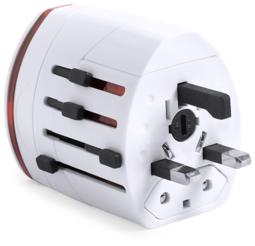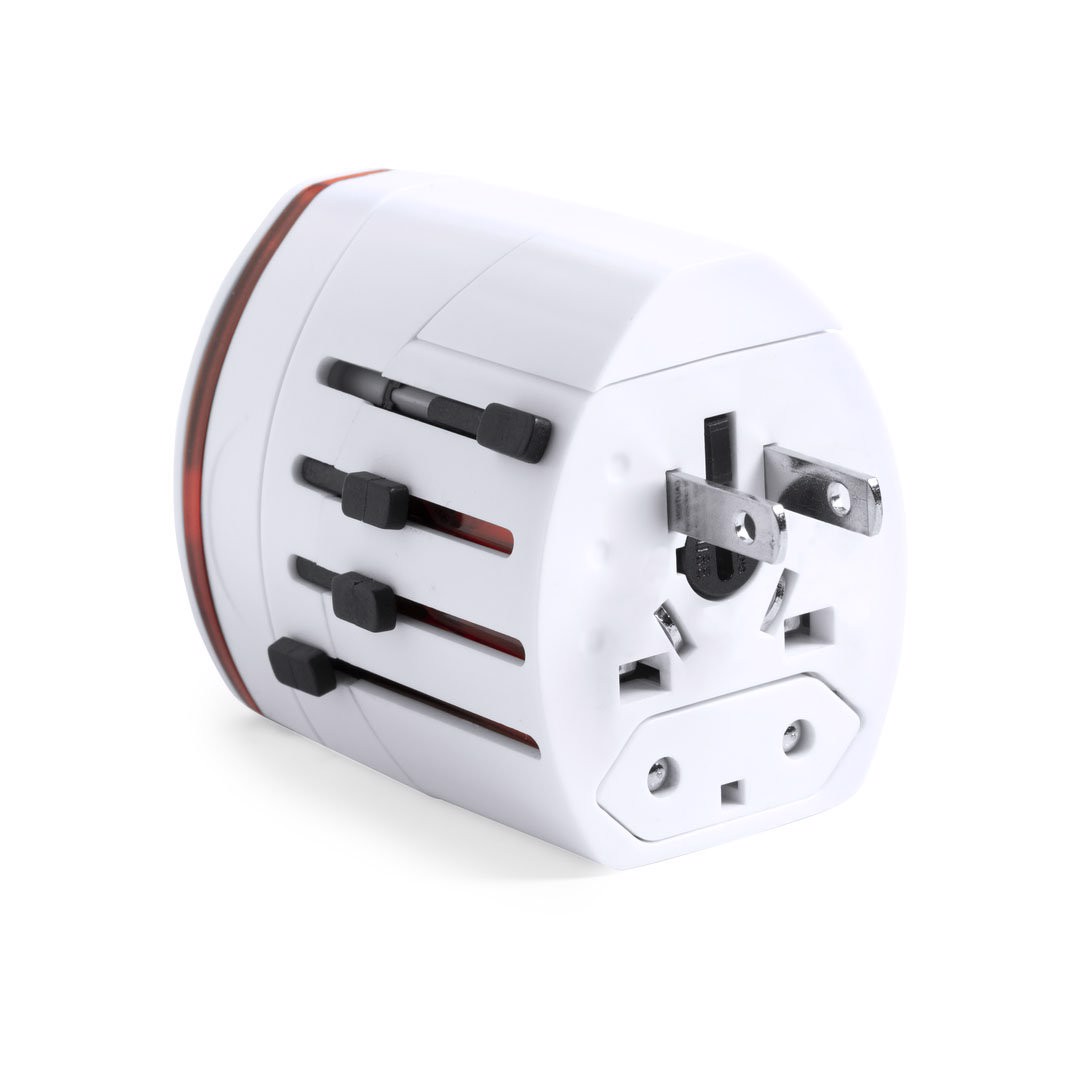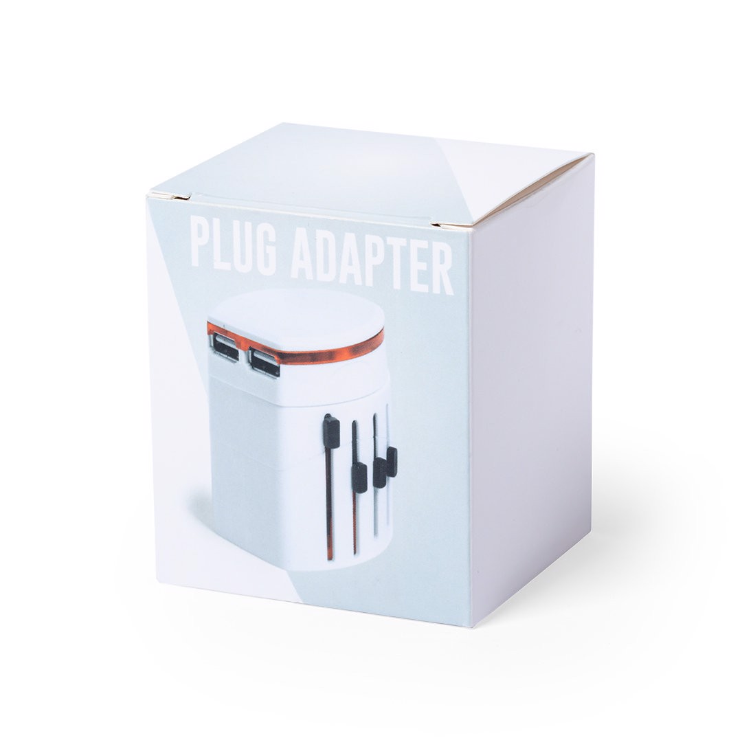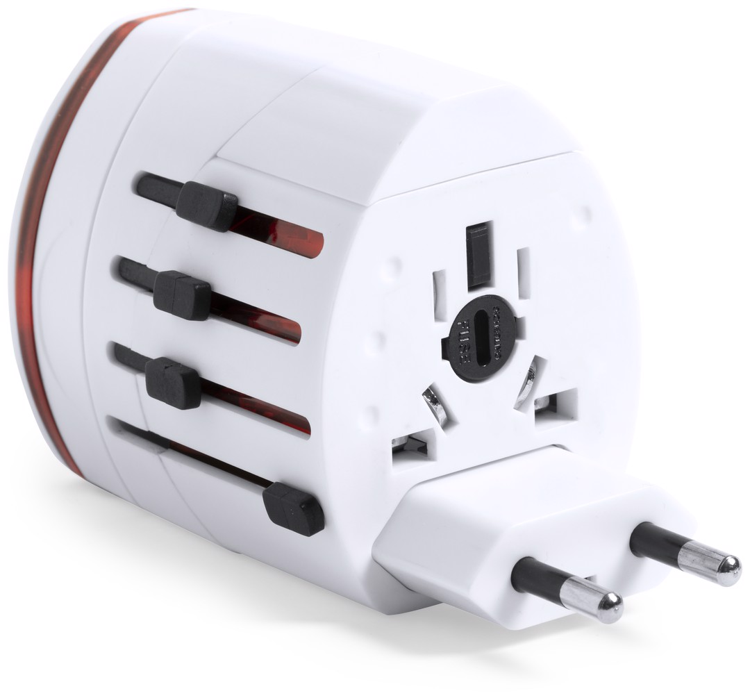 Travel/office adapter with double USB output. In an elegant bicolor design, with a wide printing area. 2 USB outputs with 2,100 mA, capable of charging 2 devices simultaneously and a bold, retractable design for wall plugs: USA, Europe, Asia, UK and Australia. Presented in an attractive design box. 2 USB Outputs 2100 mA. USA, Europe, Asia, UK, Australia