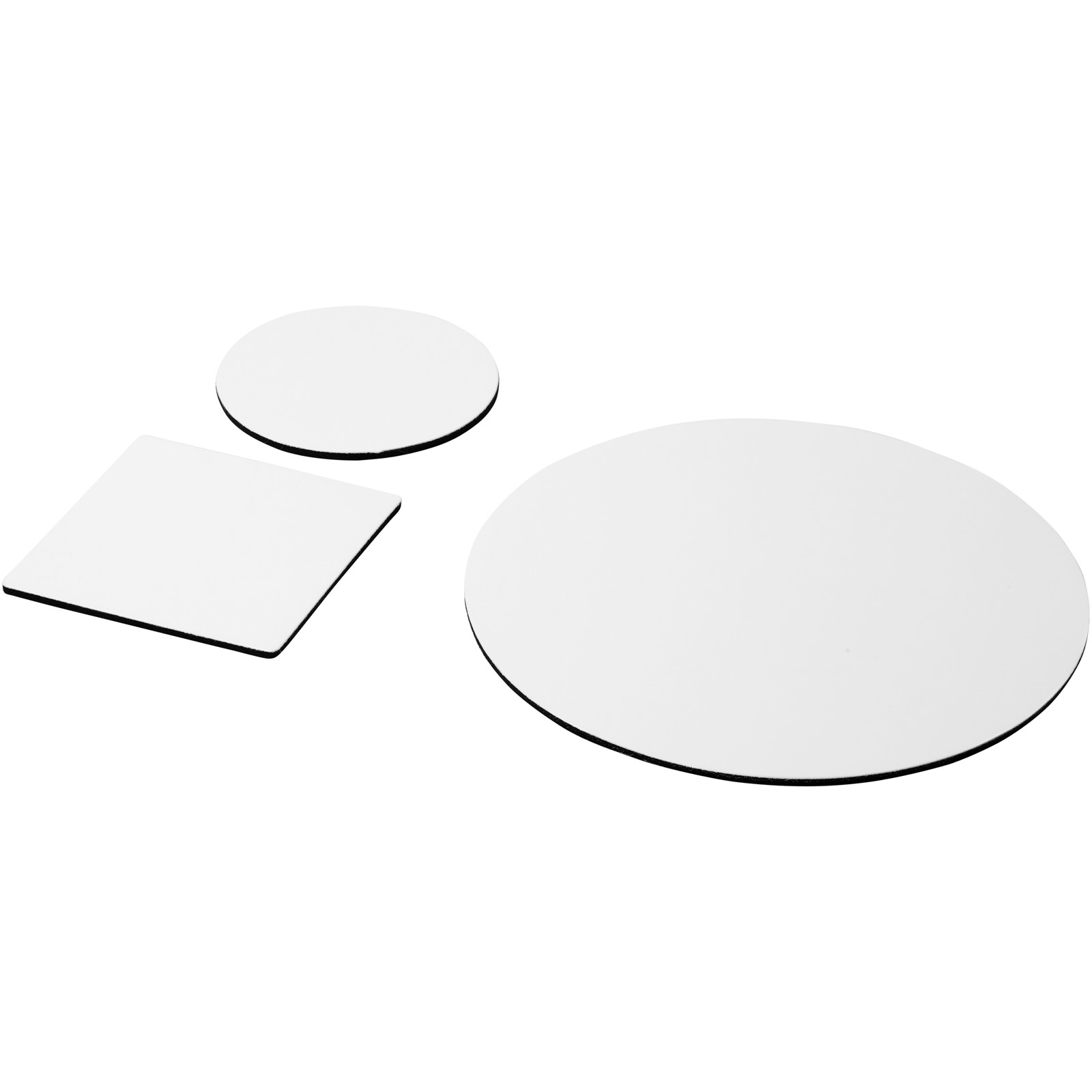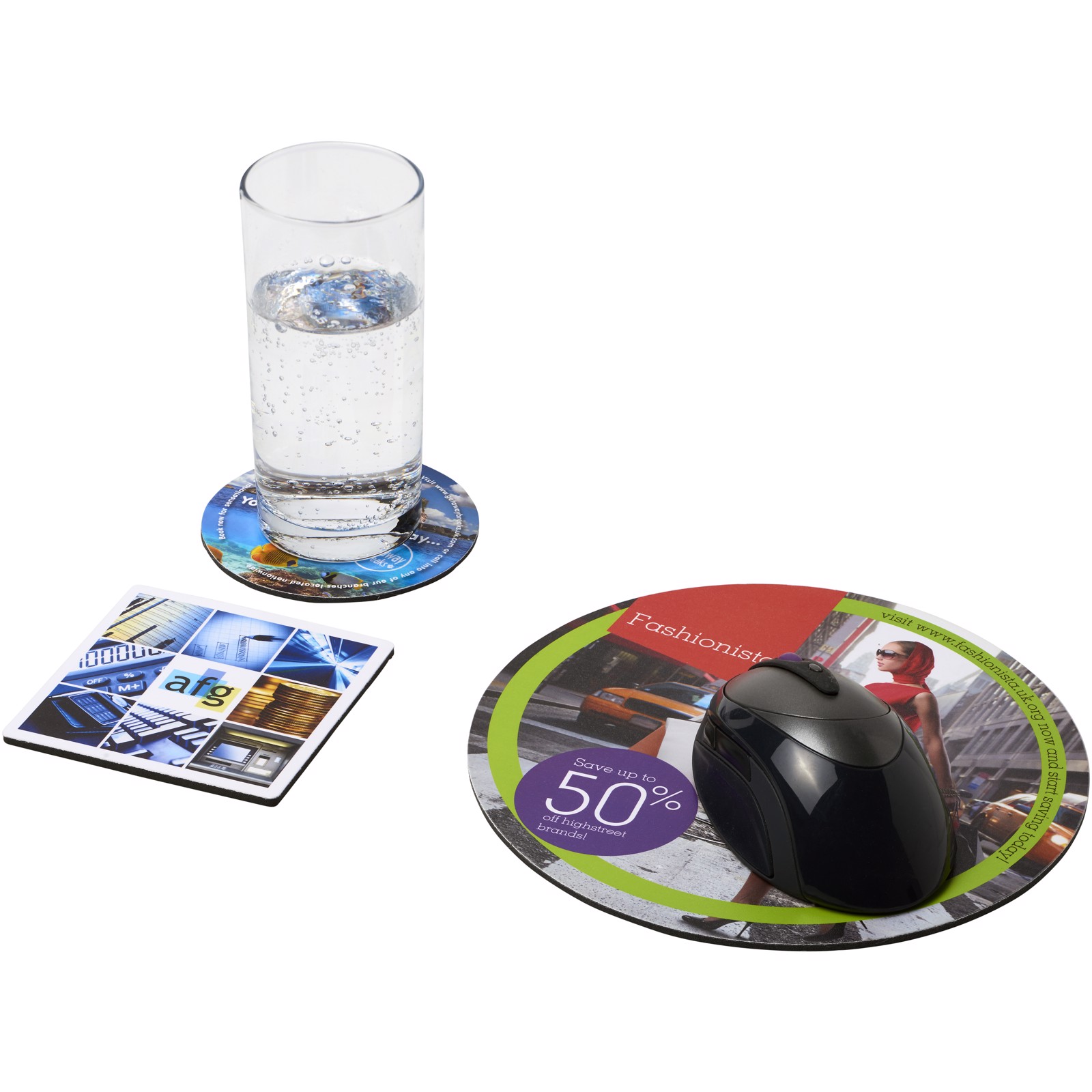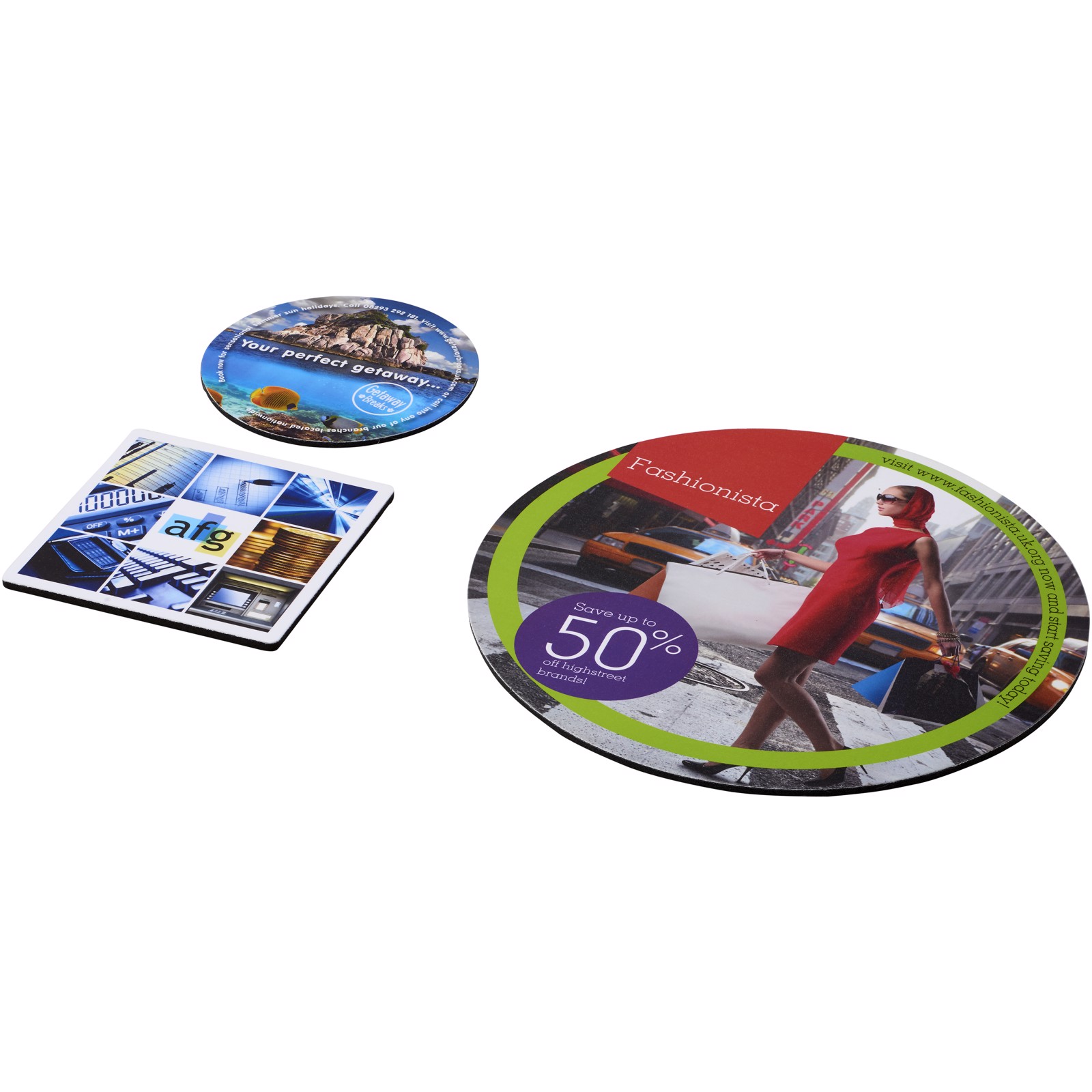 Zahrnuje podložku pod myš Q-Mat a sadu dvou odpovídajících tácků s designem Vaší firmy. Sada se skládá z kulaté podložky pod myš (0,3 x ø 20 cm), čtvercového tácku (0,3 x 9,8 x 9,8 cm) a kulatého tácku (0,3 x ø 9,8 cm).