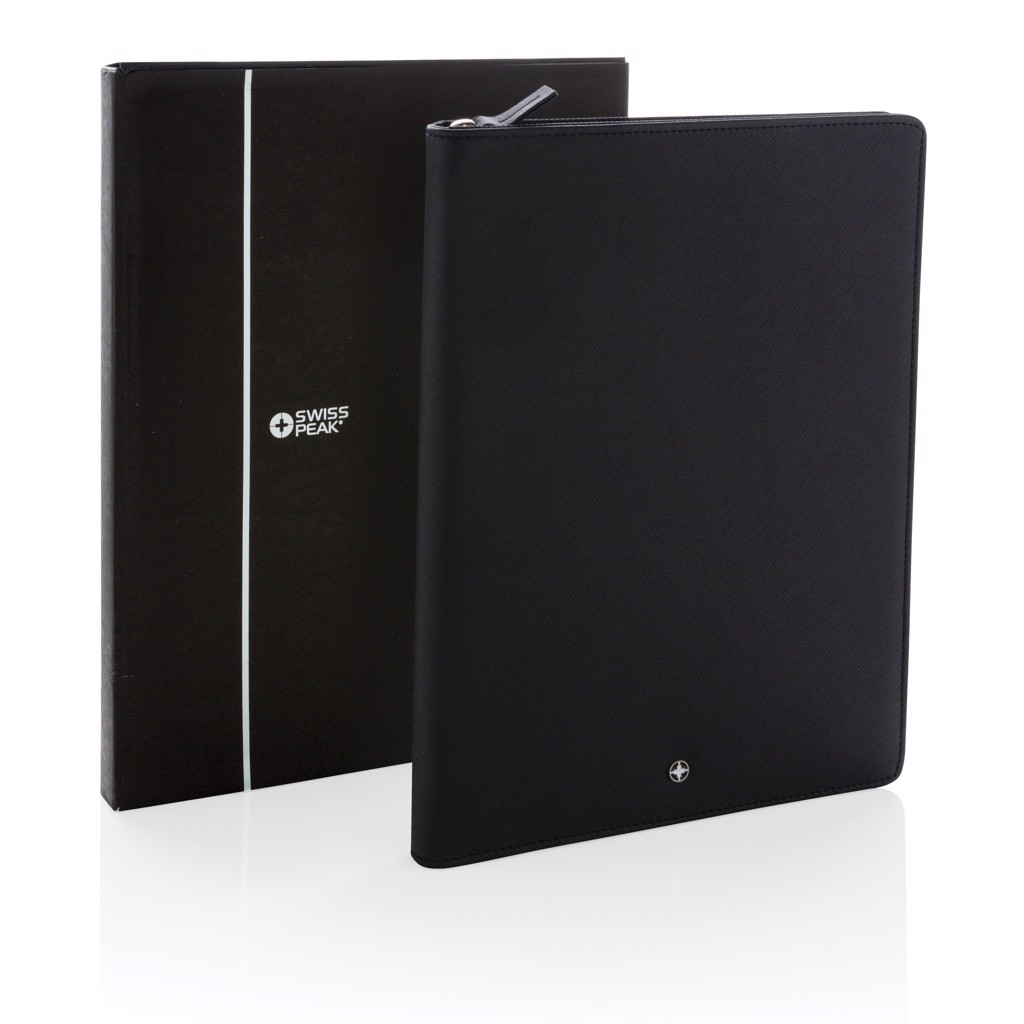 Kolekce Swiss Peak Heritage mluví jazykem moderní elegance. Obal je vyroben z PU v ikonickém italském designu s luxusním lesklým zipem. Vnitřní část nabízí stojánek na telefon nebo tablet, držáky na příslušenství, pouzdra na vizitky a přihrádky na vaše poznámky či dokumenty. Včetně poznámkového bloku A4.