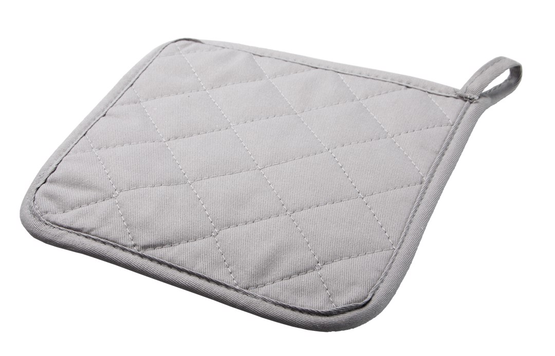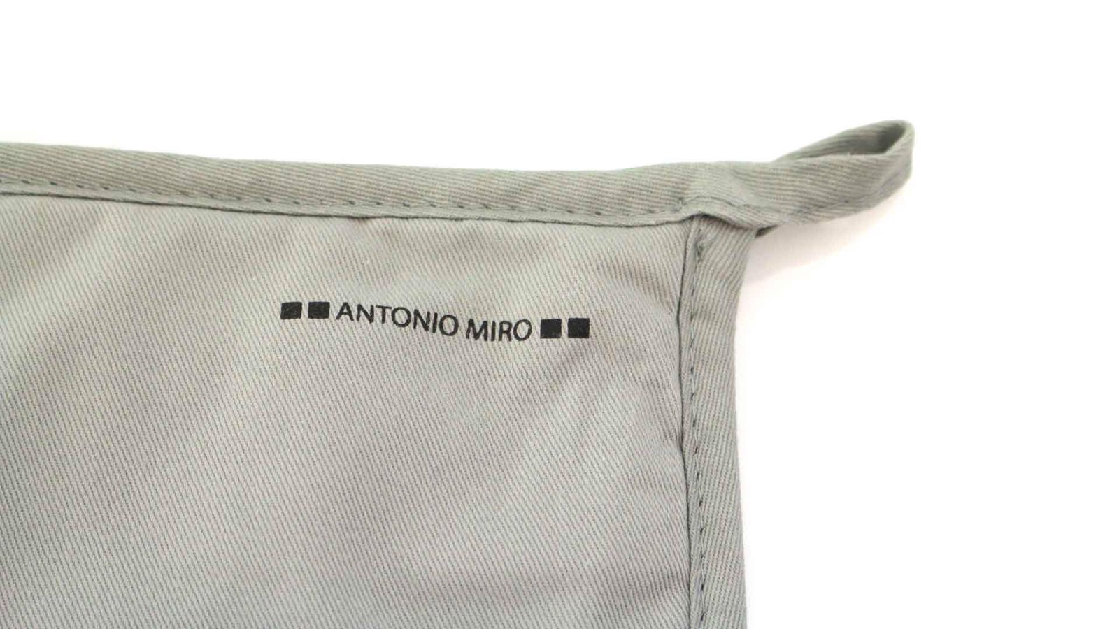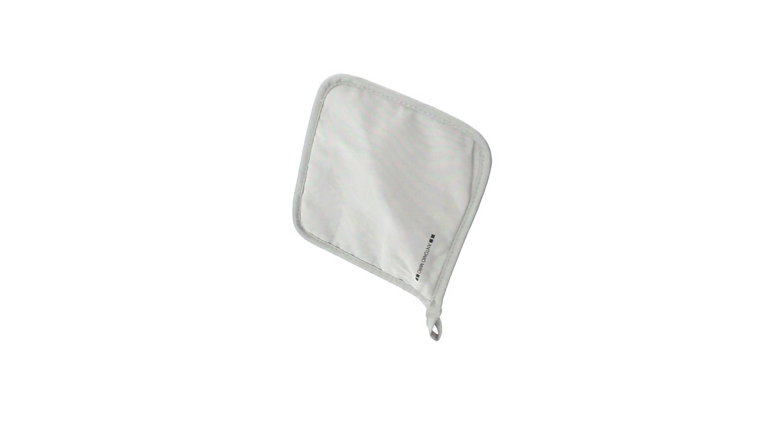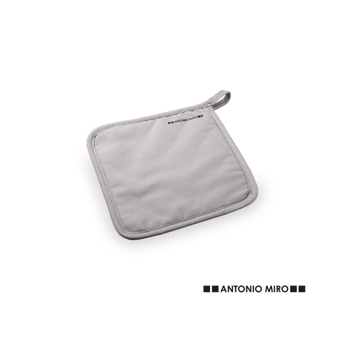 Kitchen grip by Antonio Miró in soft 100% cotton material. With an elegant natural gray color finishing and a plain side, especially designed for printing. With a hanging ribbon and the brand logo in one corner. One Flat Side for Printing