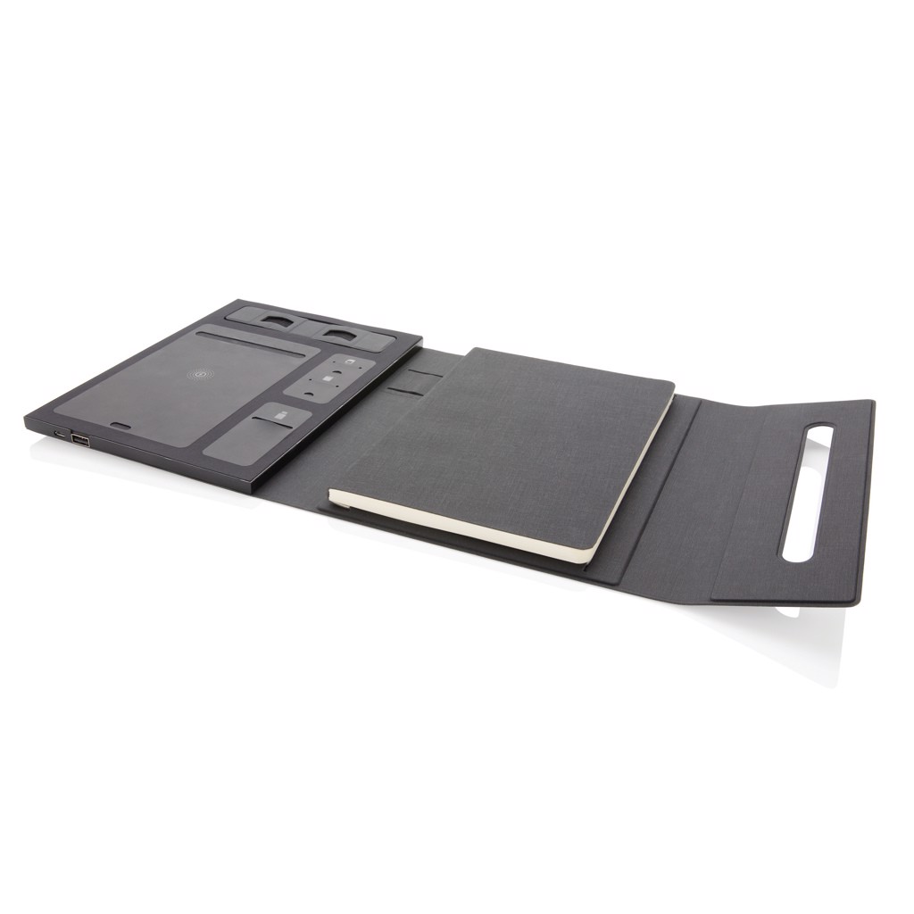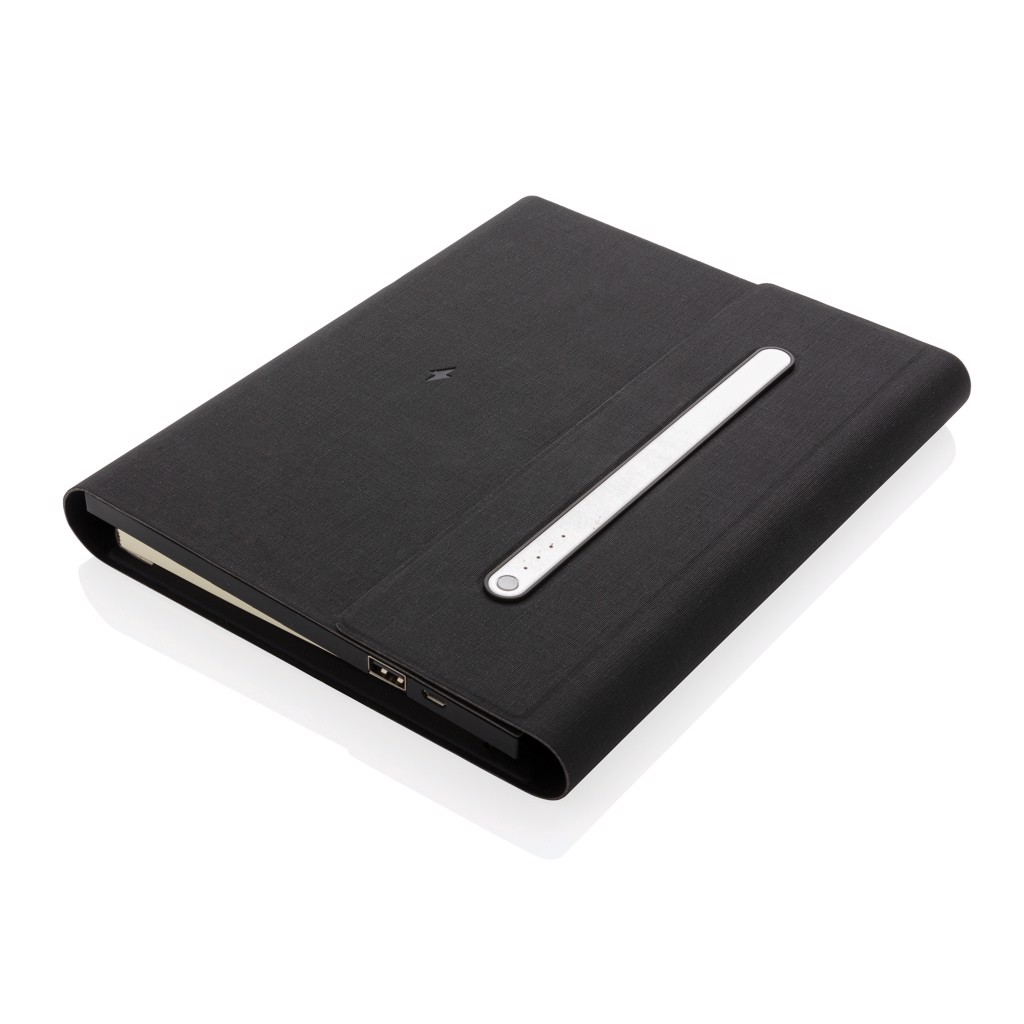 Moderní poznámkový blok se zabudovanou powerbankou 5 000 mAh a 5W bezdrátovým nabíjením. Obsahuje 64 listů/128 stran krémového papíru o gramáži 80g/m2, stojánek a kapsu na telefon a další kapsy na kabel či SD karty. Bezdrátové nabíjení je kompatibilní se všemi telefony podporujícími QI, jako jsou nejnovější generace Android, iPhone 8 a výše. Vstup: 5V/2.1A. Výstup USB: 5V/2.1A.