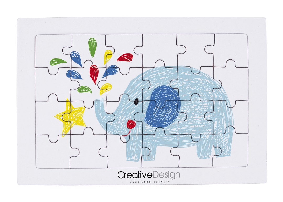 Fun puzzle of 24 pieces in white. With a box of 4 crayons in yellow, green, blue and red colors included. 24 Pieces. 4 Crayons Included