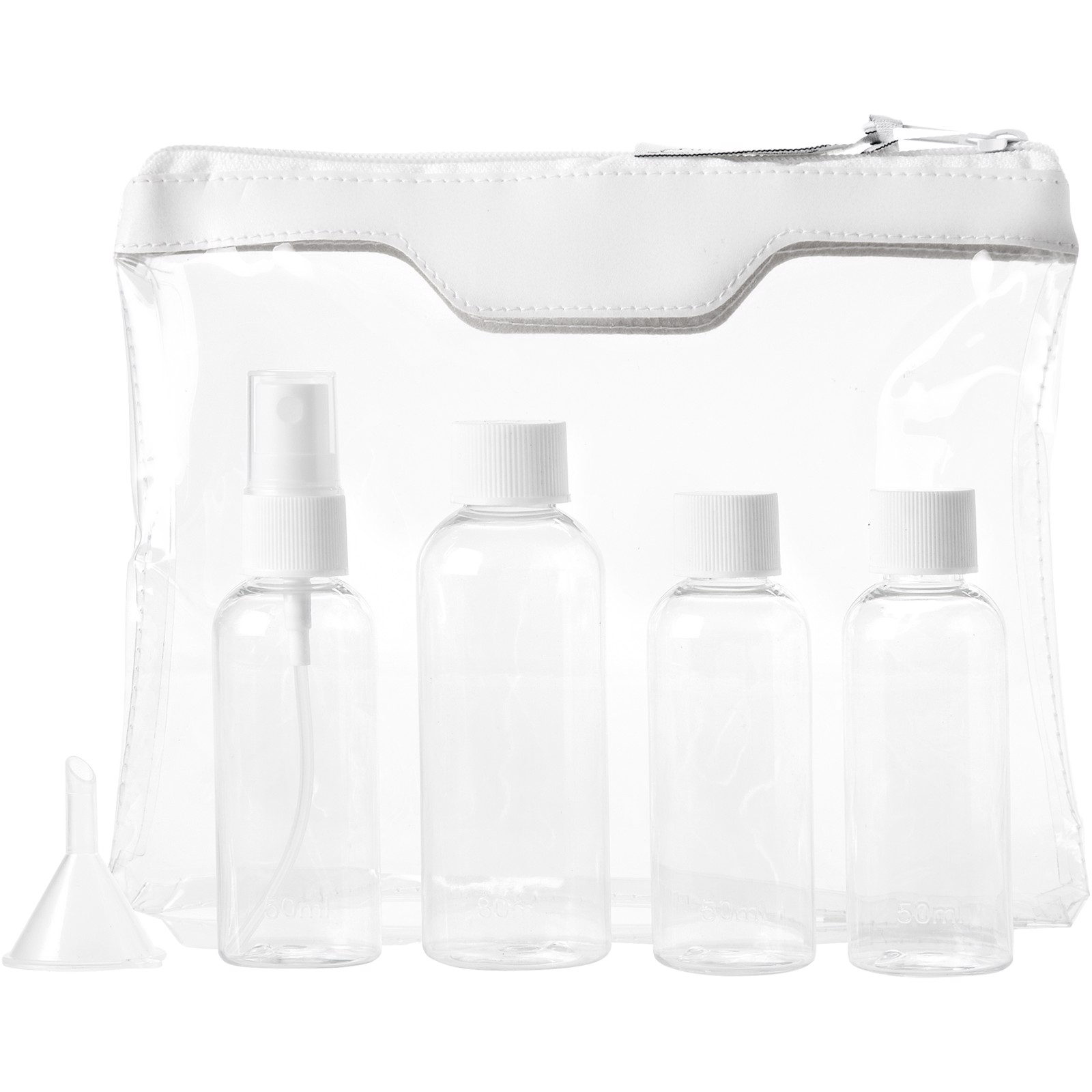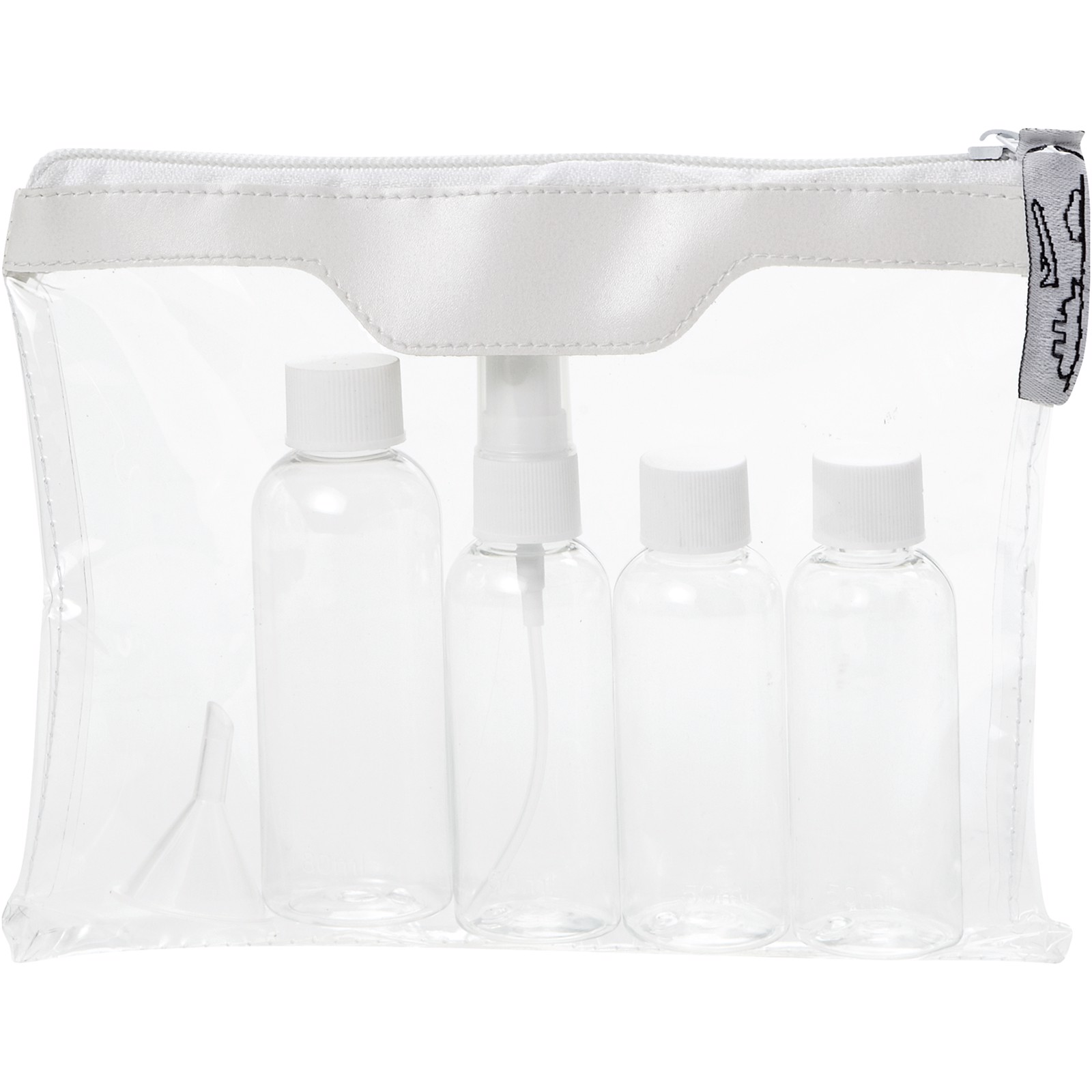 Toaletní taška schválená leteckými společnostmi, kterou si můžete vzít s sebou na palubu letadla. Obsahuje dvě lahvičky 50 ml, jednu lahvičku 90 ml, jeden rozprašovač a nálevku. Lahvičky, rozprašovač a nálevka jsou baleny v sáčku, dodávají se samostatně, nikoli v pouzdru. Reklamní potisk nelze provést na komponentech.