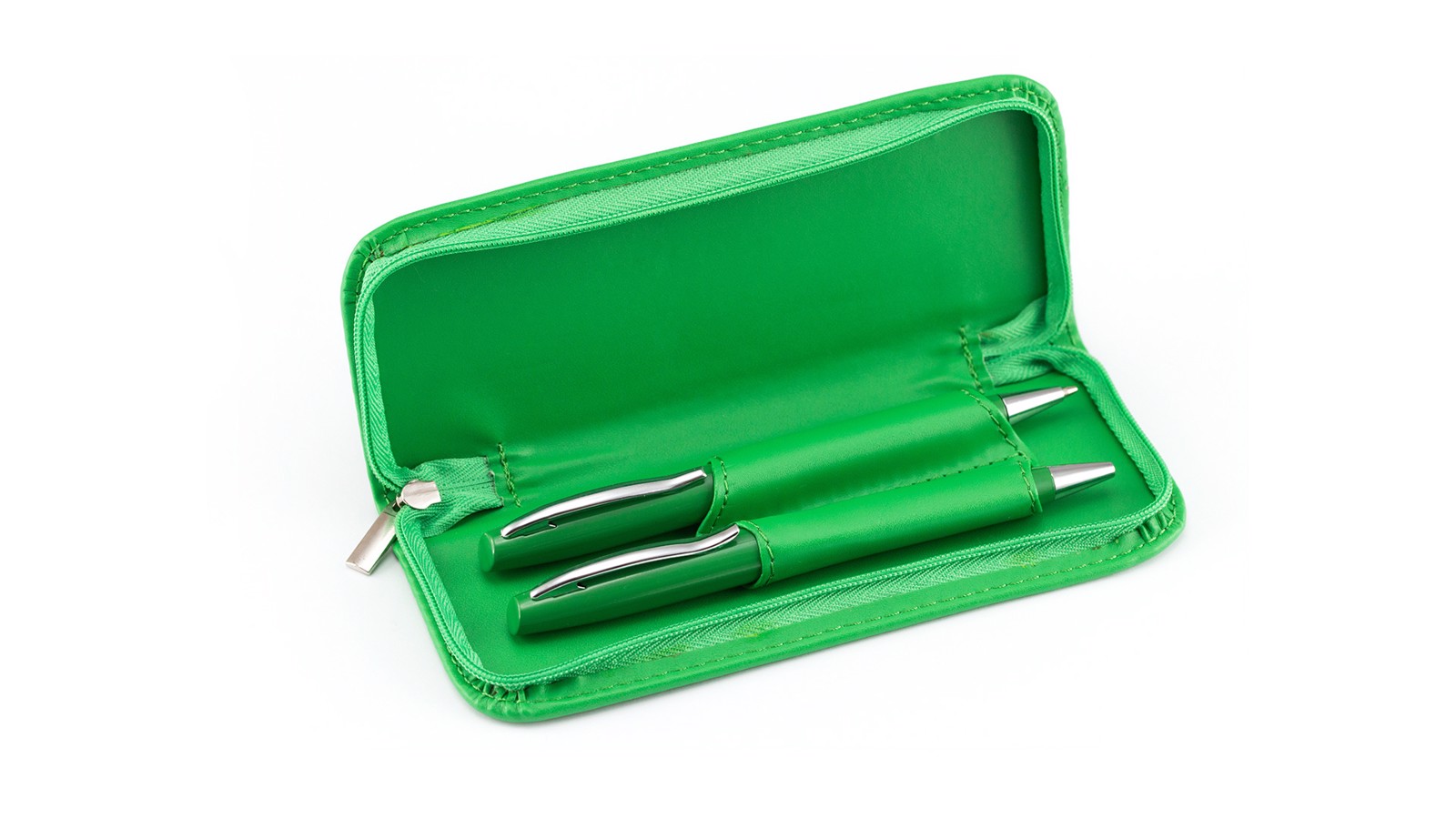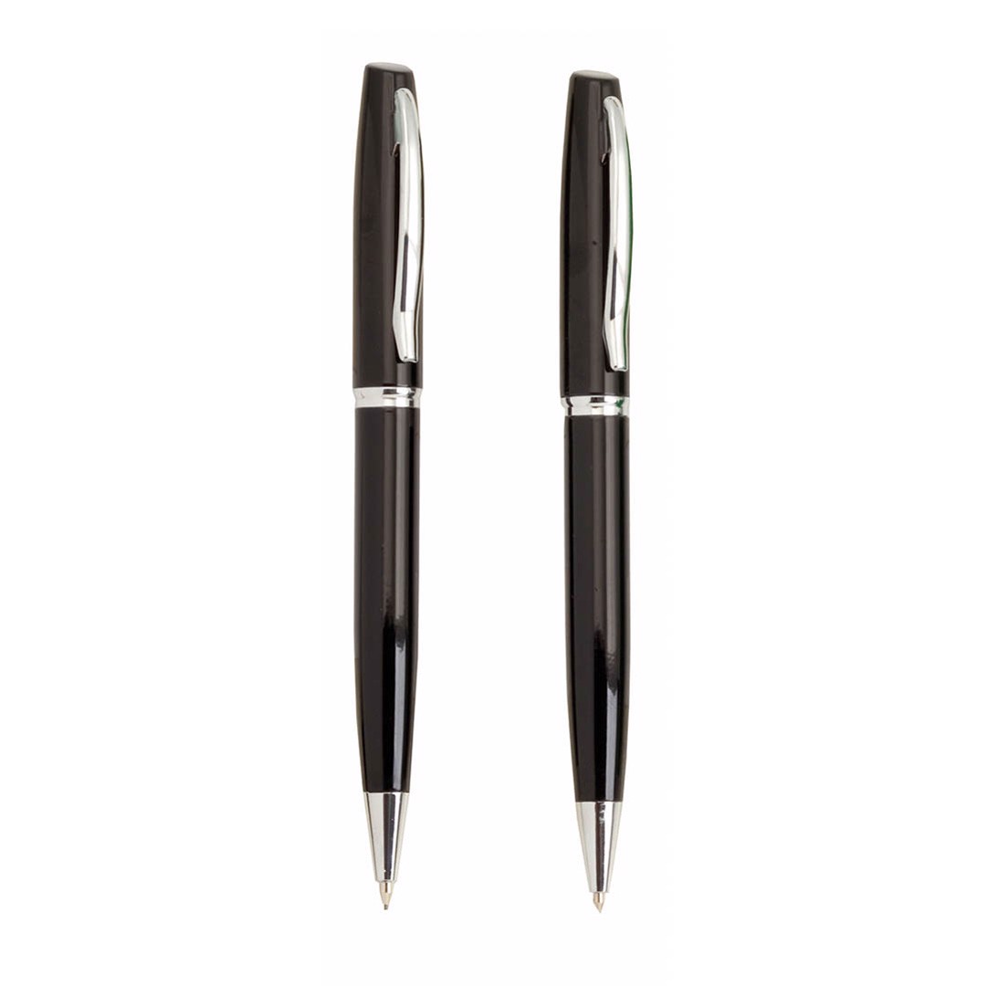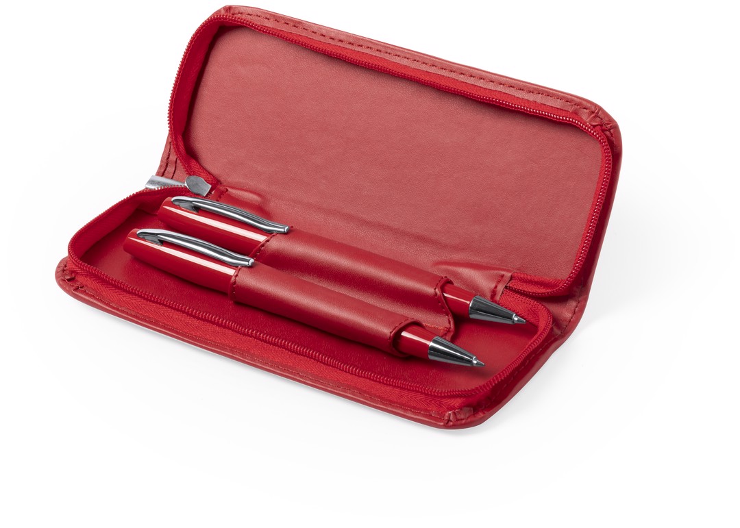 Set of ball pen with twist mechanism and mechanical pencil in bright bicolor design. Metal body in a smooth finish with bright tones and accessories in silver colors. Comfortable, matching color handle and elegant individual PU leather case with independent sleeves and matching color zipper closure. Blue ink ball pen and pencil with 0,7mm leads included. Pen. Mechanical Pencil: 0,7 mm Leads Included