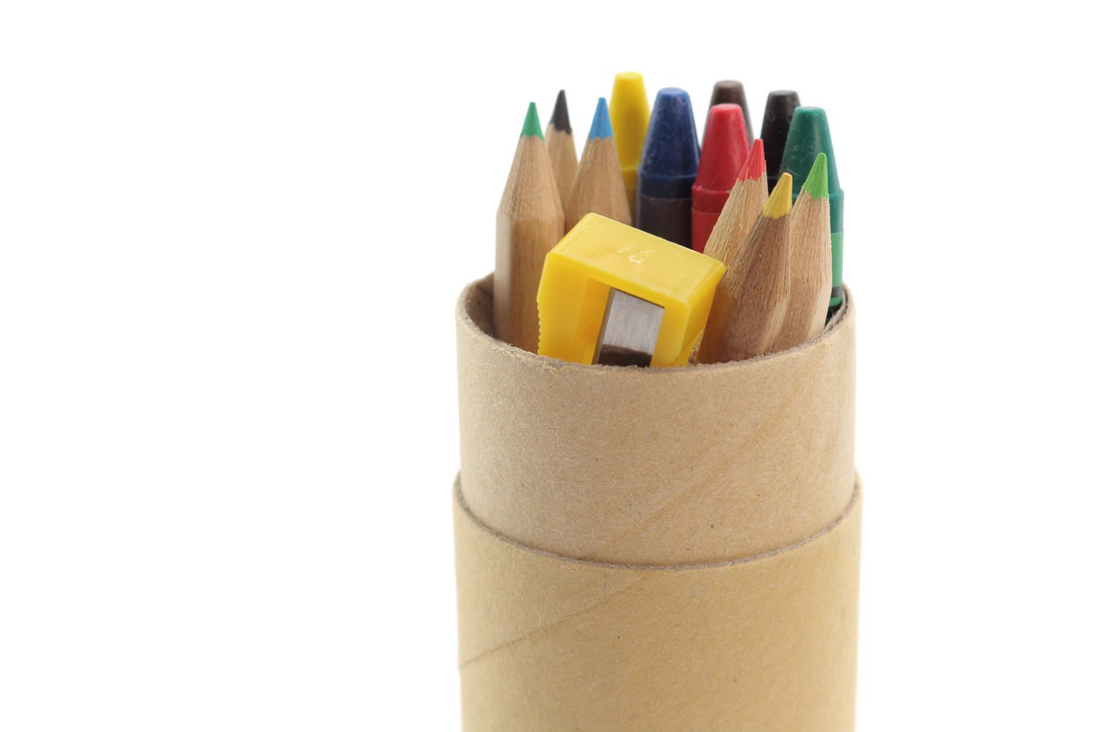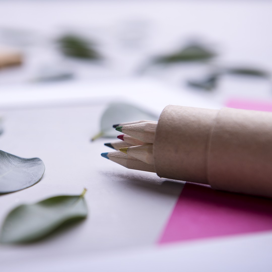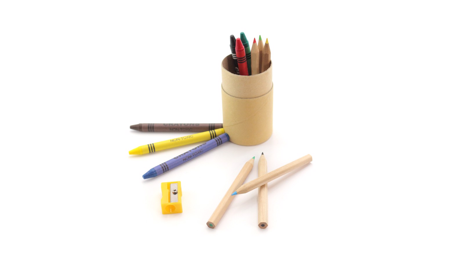 Set of 13 pieces in a cylindrical box of natural cardboard. Includes 6 wooden pencils with hexagonal body of natural finish and mines in varied colors, pencil sharpener in yellow color and 6 crayons of cylindrical body in a varied range of bright tones. 13 Pieces